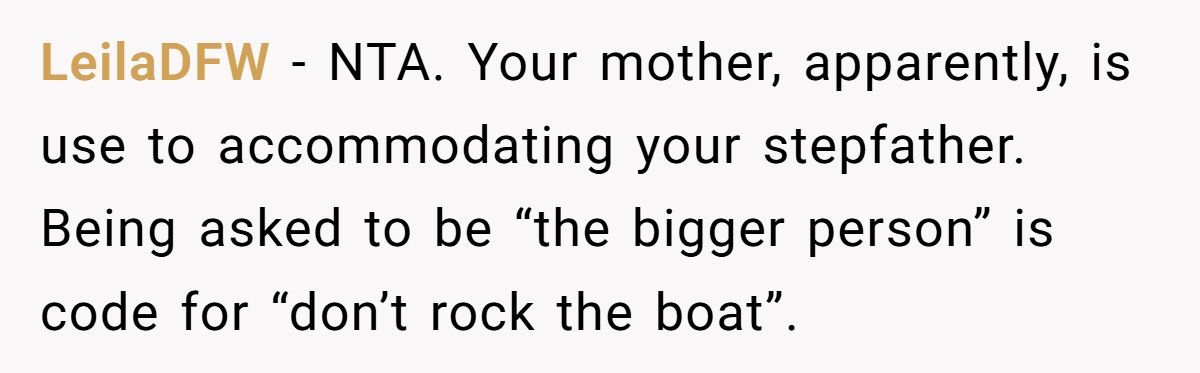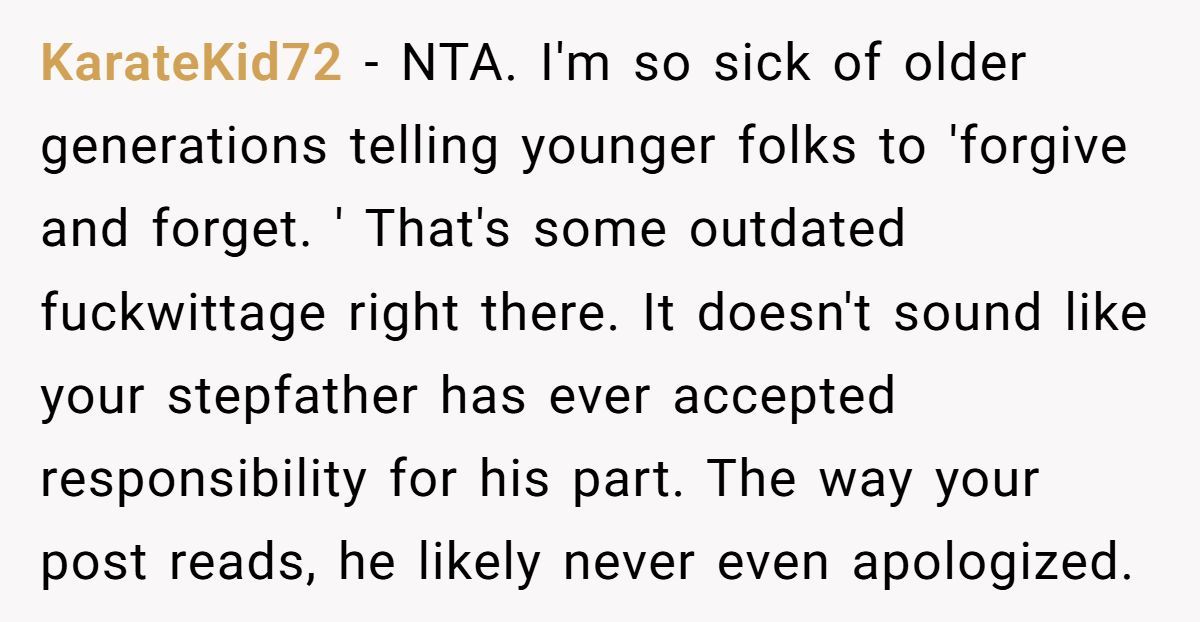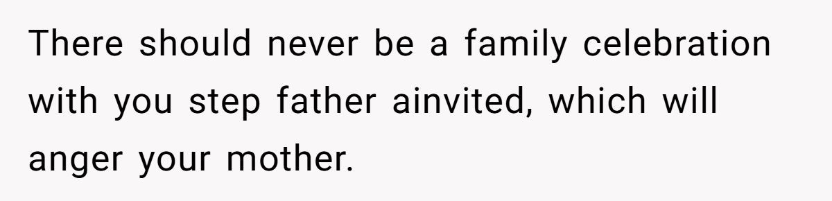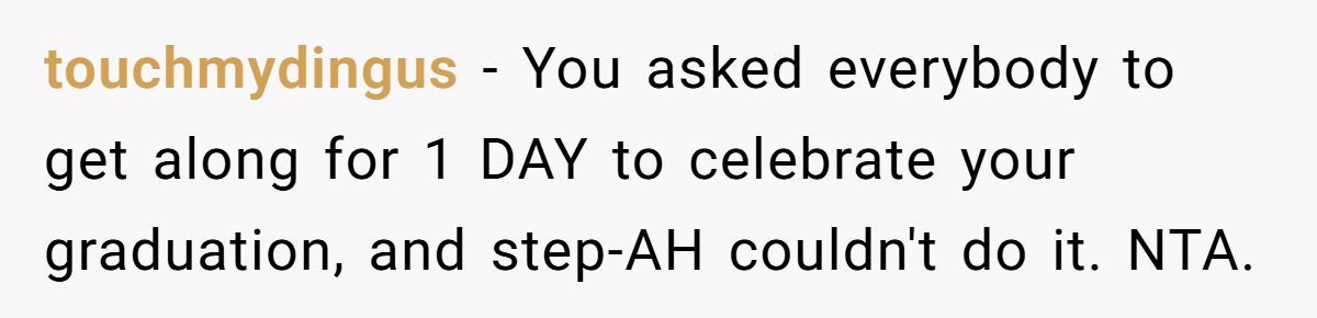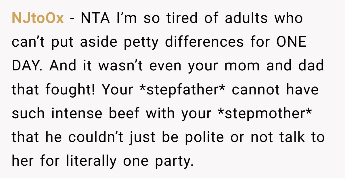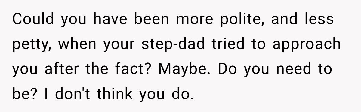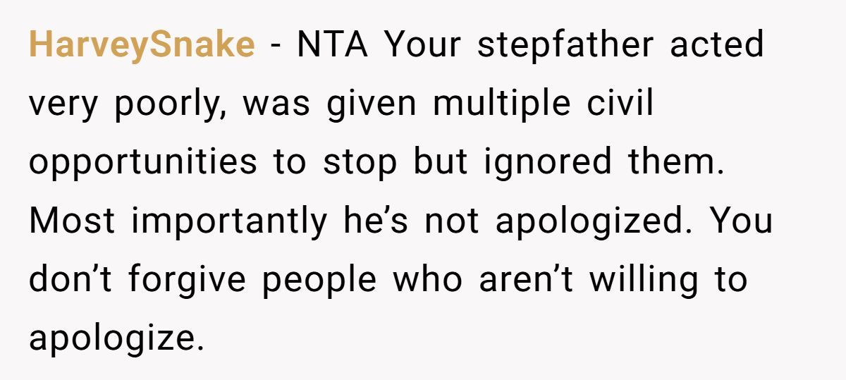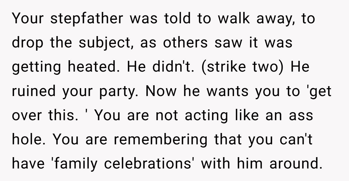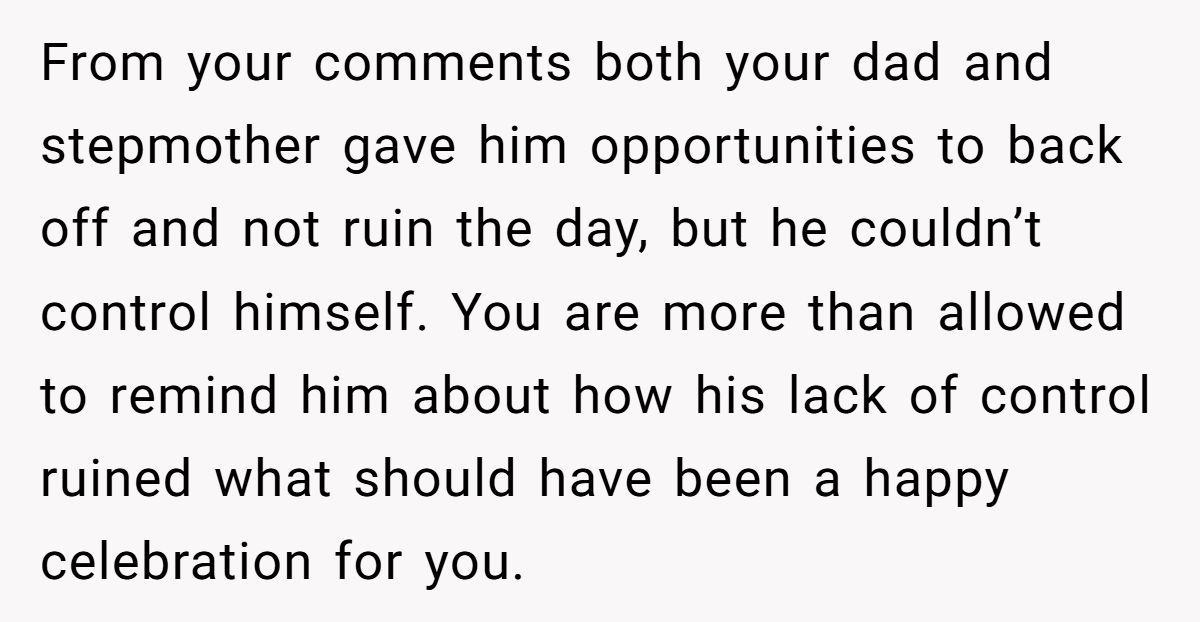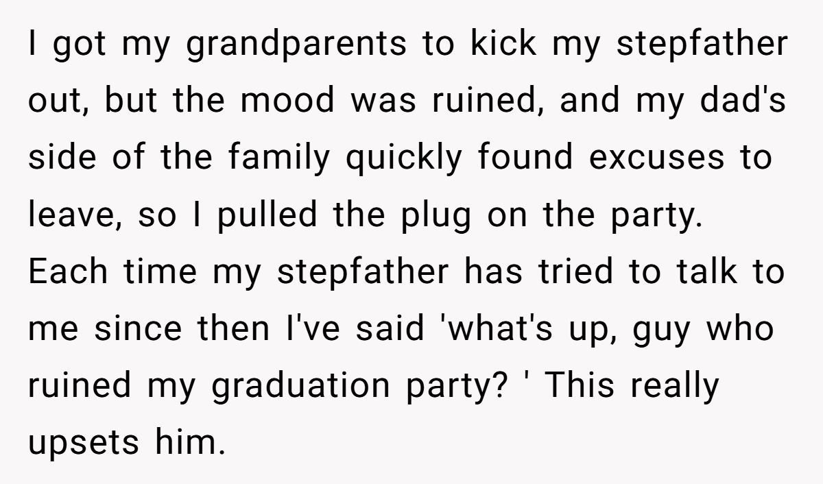 Their stepfather’s behavior turned a milestone into a meltdown, and the wounds haven’t fully healed. Whether the Redditor’s pointed comments are justified or excessive depends on your view of family loyalty, forgiveness, and personal boundaries.