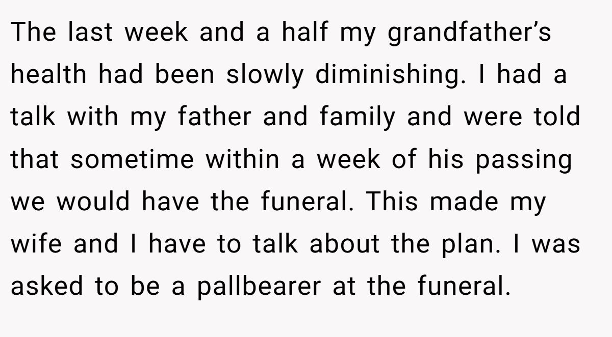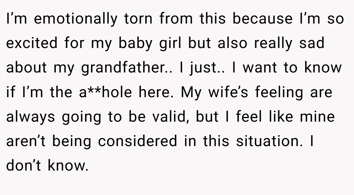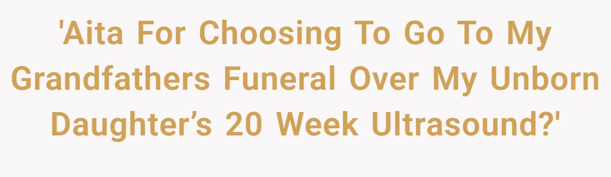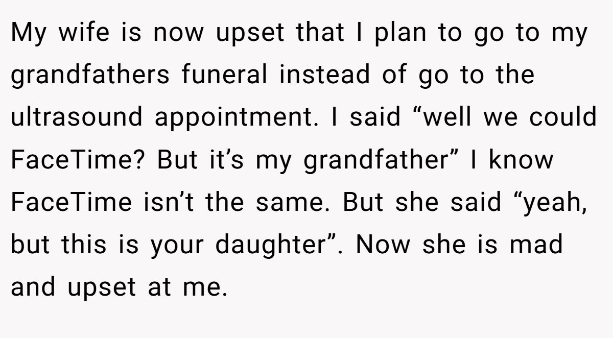 Choosing between a grandfather’s funeral and a baby’s ultrasound is like picking between tears and joy—impossible! This Redditor, a pallbearer for his grandfather’s funeral, faces a clash with his pregnant wife, who’s upset he’s missing their daughter’s 20-week ultrasound. The appointment’s routine but special, while the funeral, a one-time farewell, carries deep family weight. Her frustration—he’s prioritizing his grandfather over their baby—collides with his grief and duty to his dad.