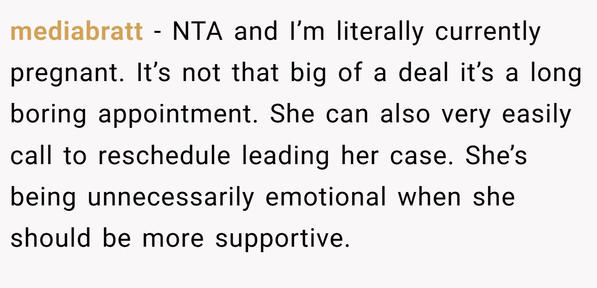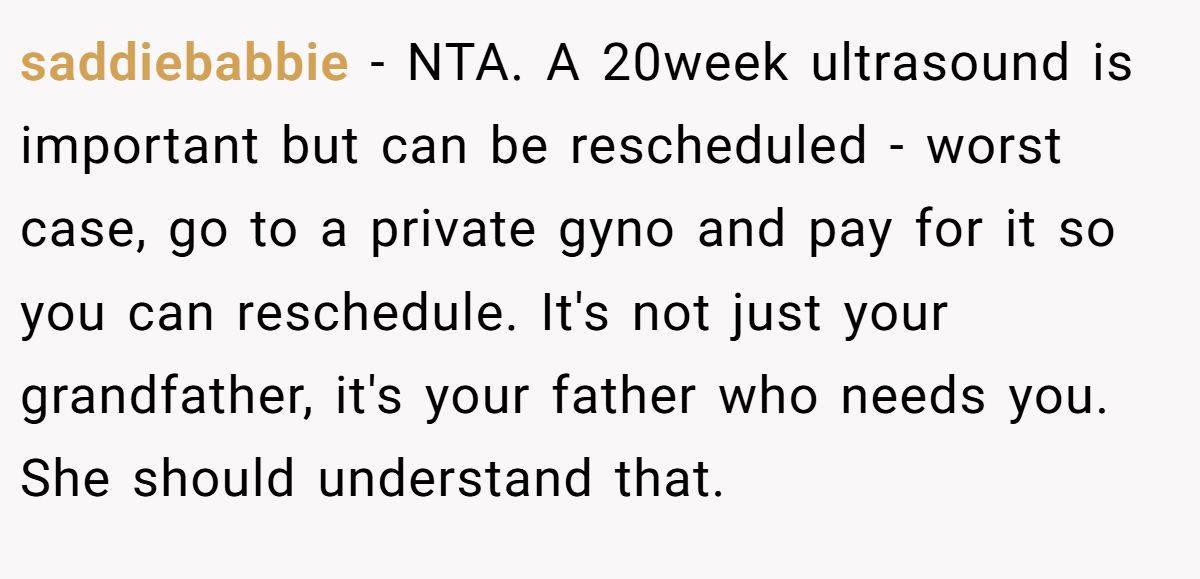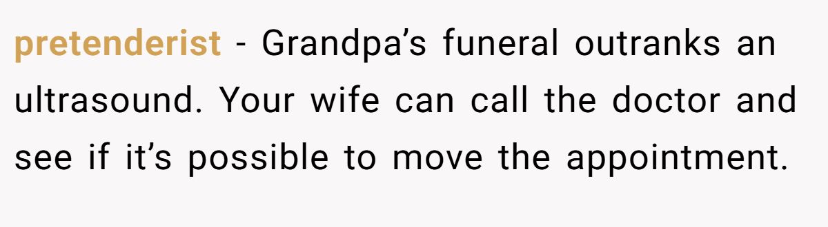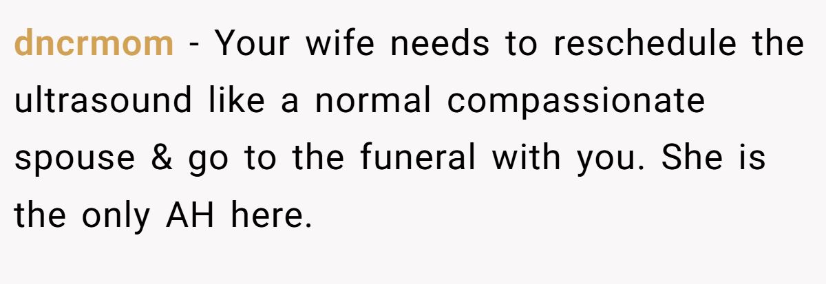 Yet, the wife’s feelings are valid. Pregnancy is emotional, and the 20-week ultrasound—a key check for the baby’s health—feels like a milestone. She might feel alone, especially staying home with the dogs while he’s away. Reddit user dncrmom suggested she could reschedule and attend the funeral, implying her reaction seems unempathetic. But pregnancy hormones and the weight of parenting solo during his absence likely fuel her upset.