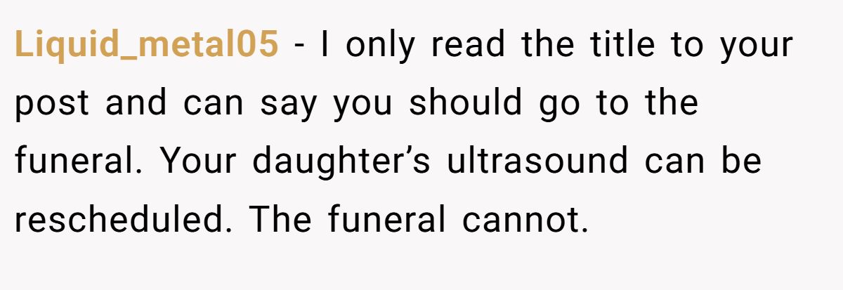 Husband’s not wrong—ultrasounds can be rescheduled, but funerals are a one-time deal.