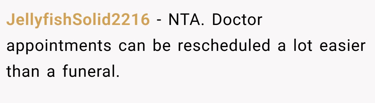 Doctor appointments are flexible, funerals aren’t—husband’s not the jerk here.