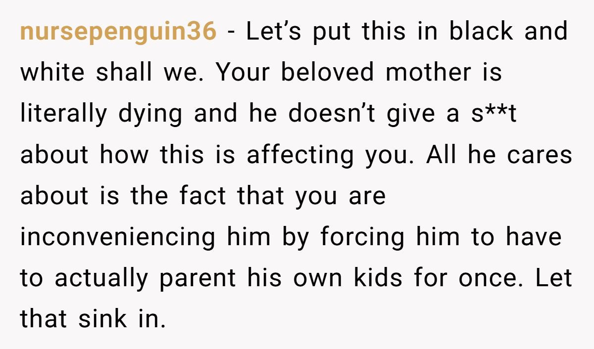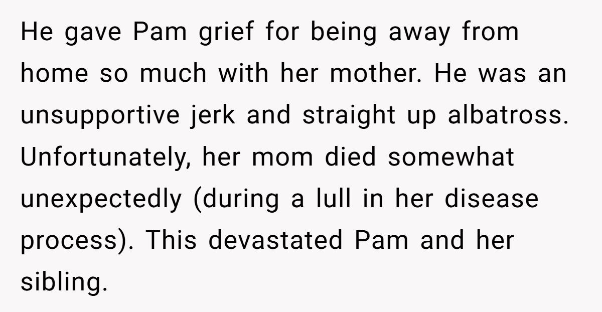 What’s the takeaway? Partners should be each other’s support beams during family loss—not another weight to carry. This Redditor wasn’t just navigating end-of-life care; she was also confronting a breakdown in her own marriage.