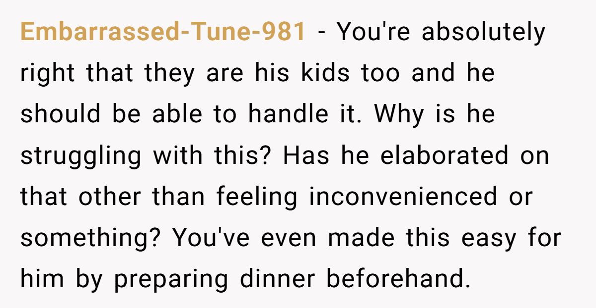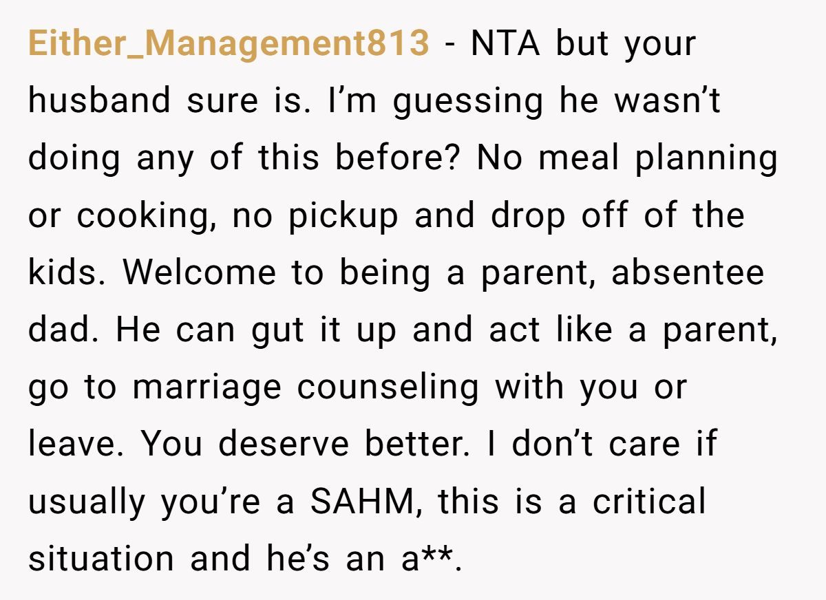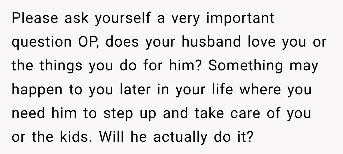 Commenters stressed the husband should be her rock, not a stressor, questioning if he loves her or just her domestic contributions