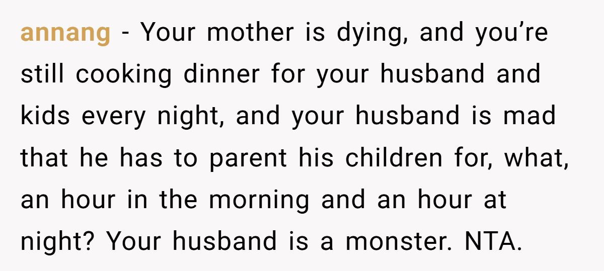 Commenters called the husband a “monster” for prioritizing his inconvenience over her grief, noting he’s failing at basic parenting