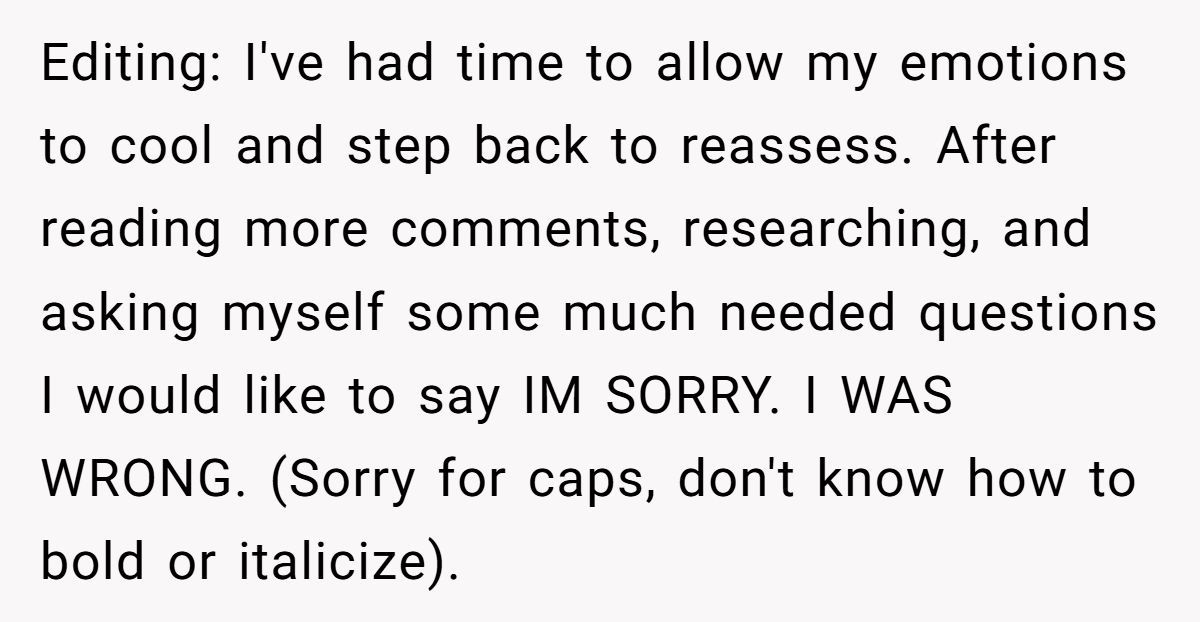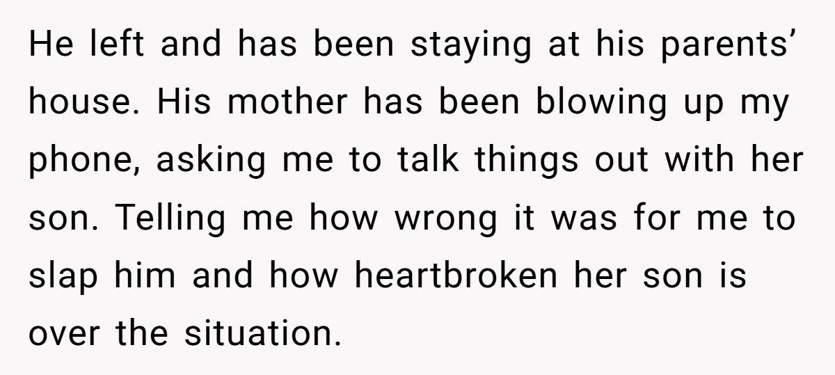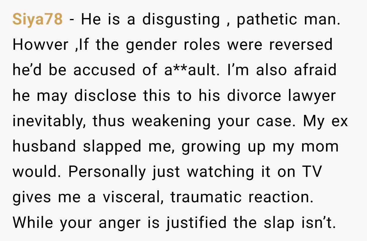 But while her anger was justified, the slap crossed a line into physical violence, which complicates her moral standing. His mother’s demands for an apology and reconciliation are tone-deaf, ignoringistante, but the Redditor’s physical response risks legal and ethical issues, especially in a divorce case.