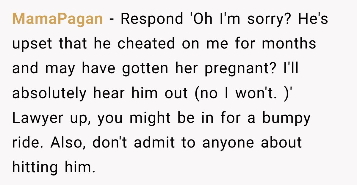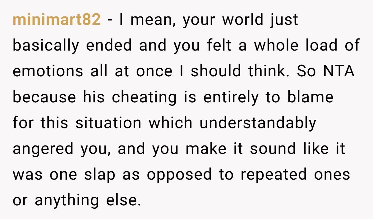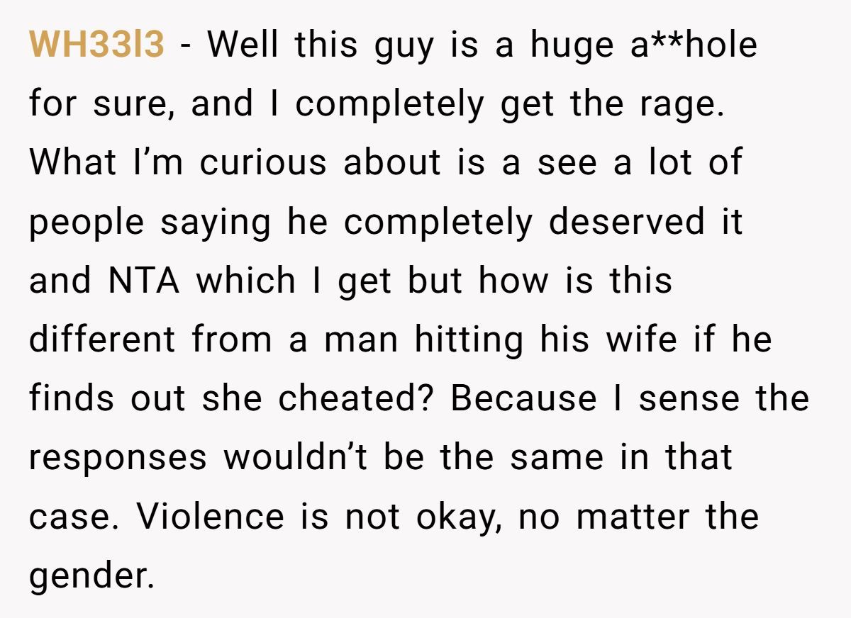 These commenters claimed the husband’s betrayal warranted rage but not violence, advising the Redditor to avoid physical reactions