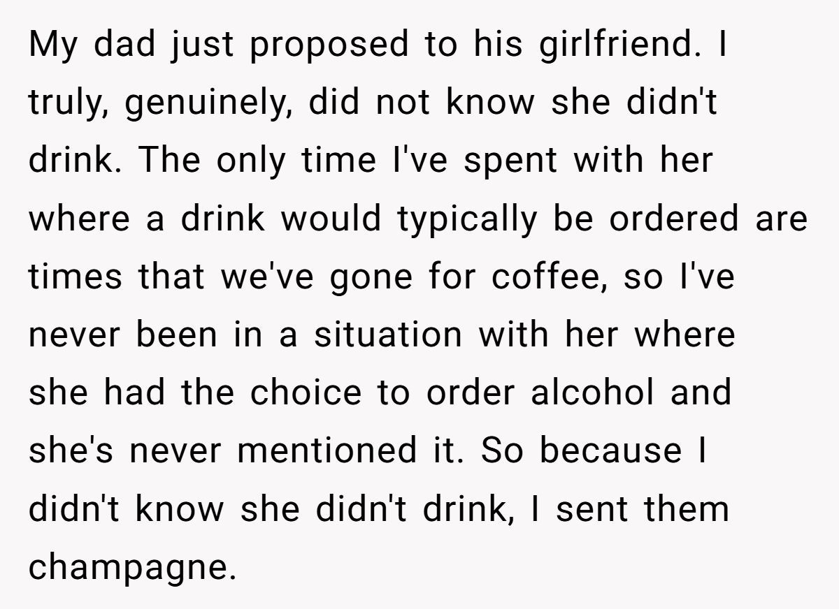 Meanwhile, expecting her to apologize for sending a bottle of champagne—a pretty standard engagement gift—is wild. If the fiancée doesn’t drink, that’s fine, but adult communication would be, “Oh, thank you, but I don’t drink.” Not a crying meltdown and a hateful slur.