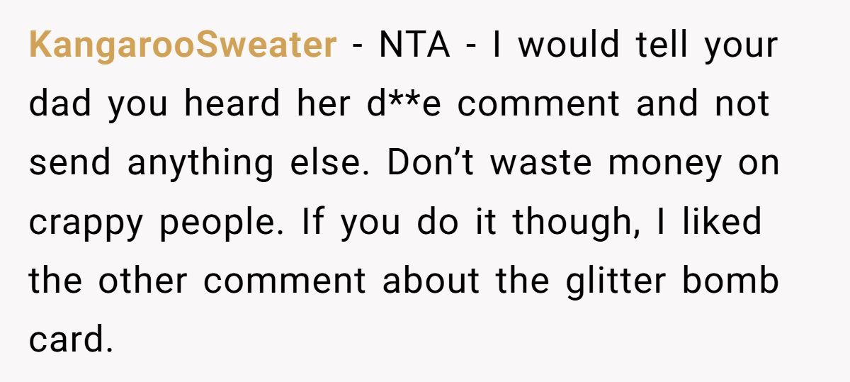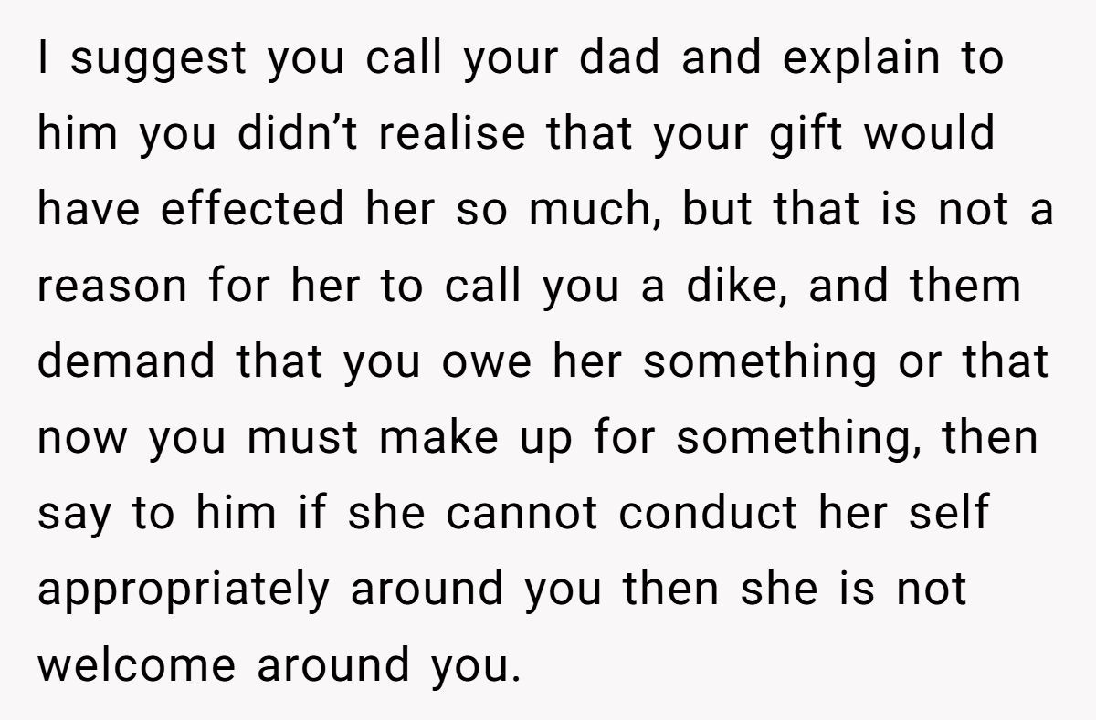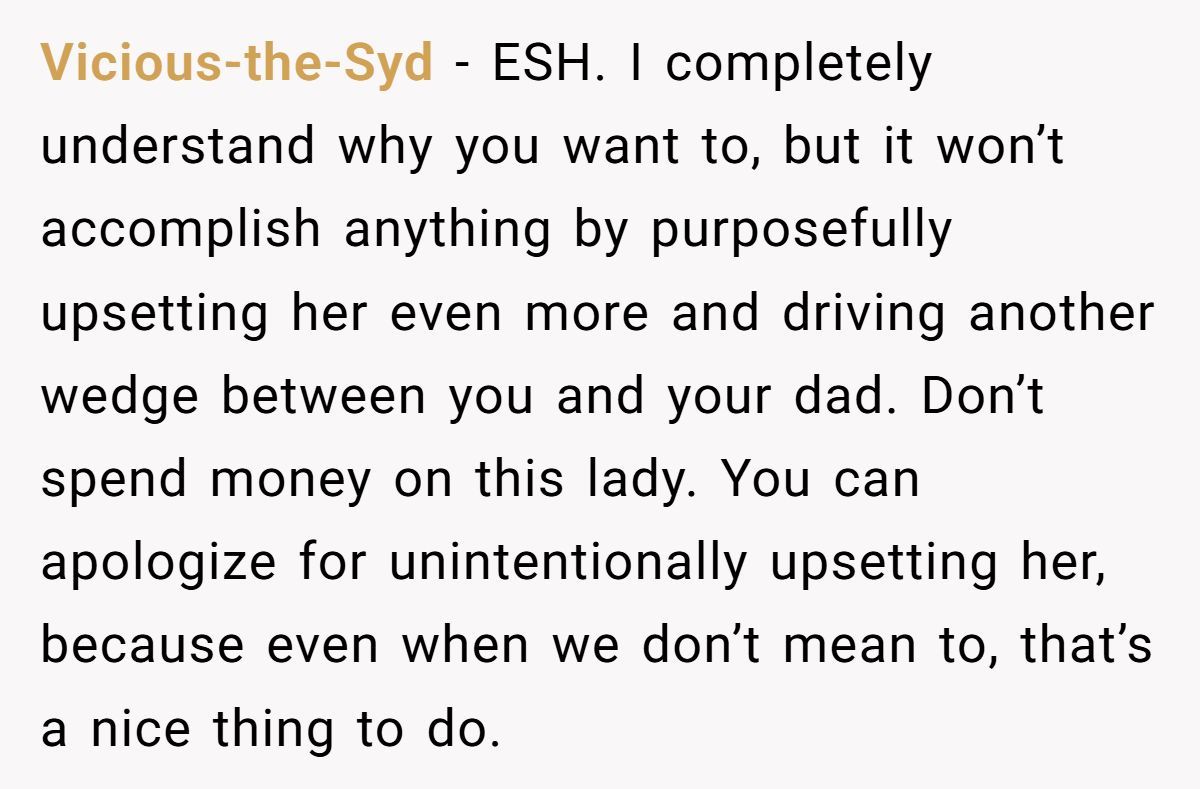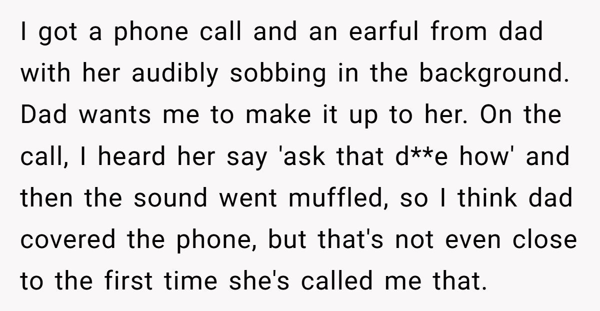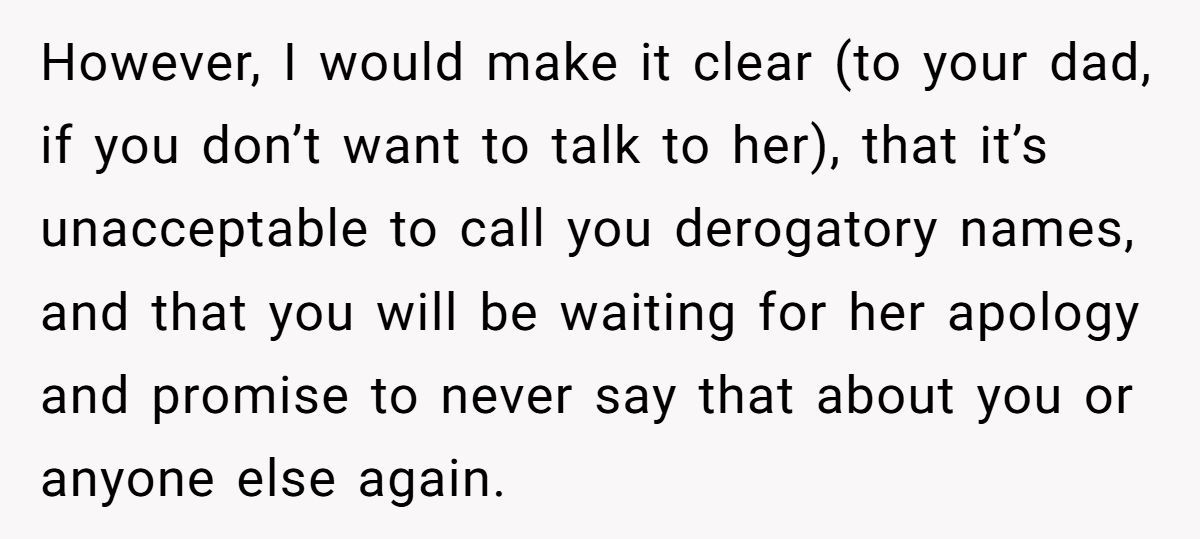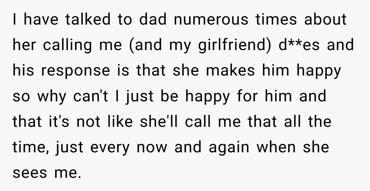 It’s also a response to gaslighting. The Redditor says she’s addressed this slur with her dad multiple times. His response? “She makes me happy, can’t you be happy for me?” That’s textbook emotional invalidation—asking someone to ignore their own pain for someone else’s comfort.