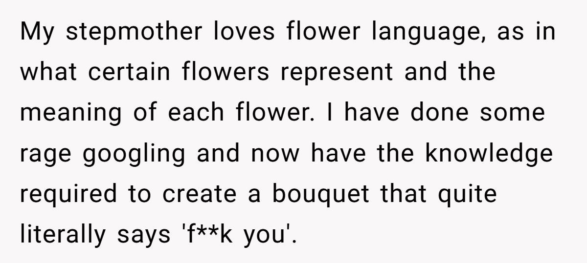 Would the flower revenge send a message? Yes. Would the stepmum understand it? Maybe. Would she care? Probably not. As one therapist might put it: You don’t need to set yourself on fire to keep someone else’s relationship warm. Sometimes, withholding contact is the message.