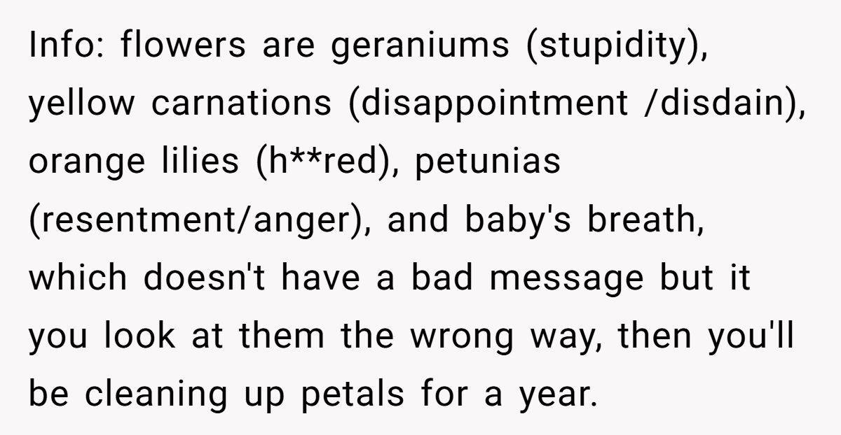 She asked Reddit if she’d be wrong to go full horticultural revenge. The internet? Had opinions. Curious what flowers mean “resentment and stupidity”? And whether dad’s ignoring something he really shouldn’t? Let’s unpack this blooming drama.