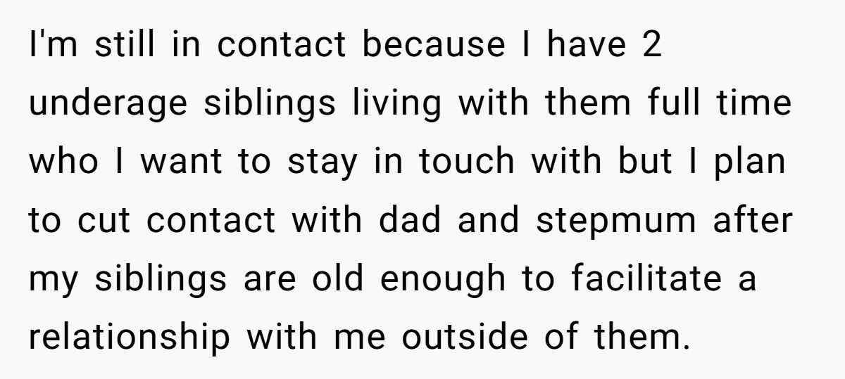 And yet, OP hasn’t cut ties. Why? Because she has two young siblings still living in that home. She’s staying in contact to make sure they don’t lose her, even if their parents have.