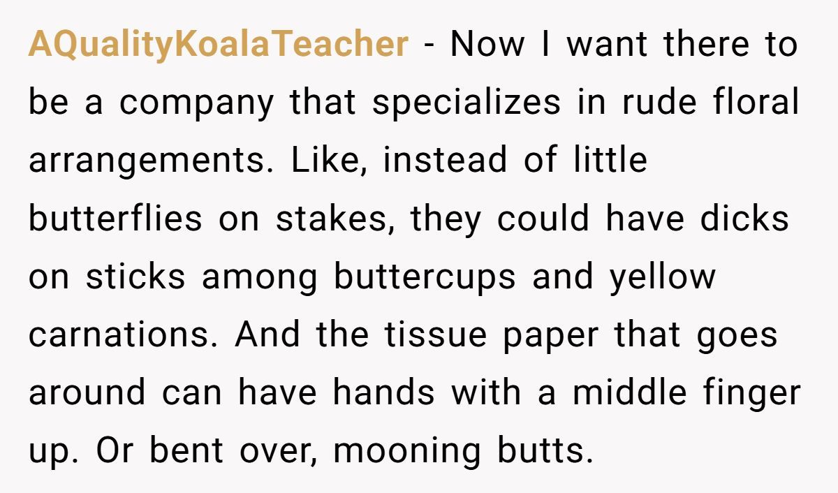One woman shared a story of planning a rude floral arrangement—using flowers like geraniums and yellow carnations to say “f**k you”