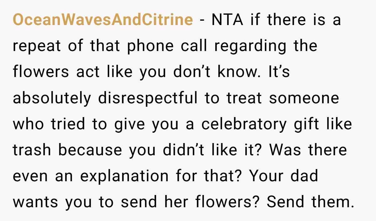 Would she be wrong to send the rude bouquet, or justified given the stepmum’s homophobia? How would you handle a family member’s slurs? Share your thoughts below!