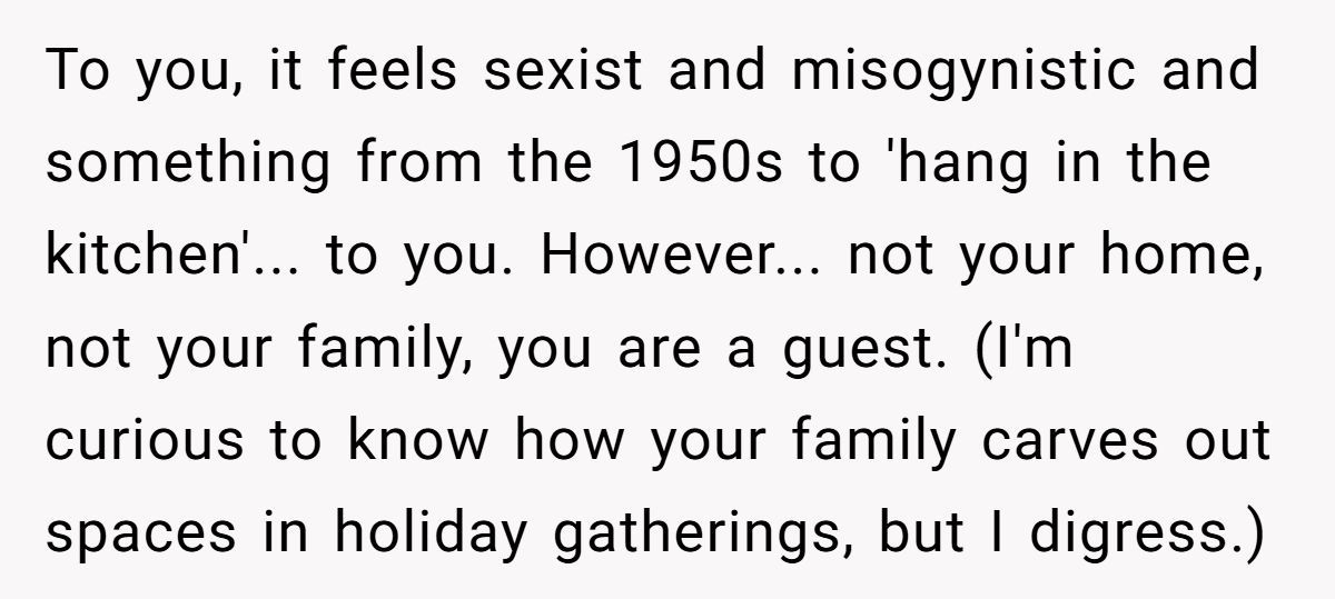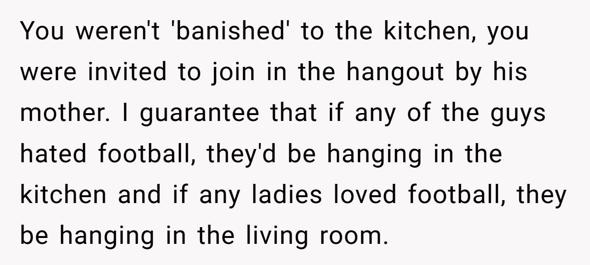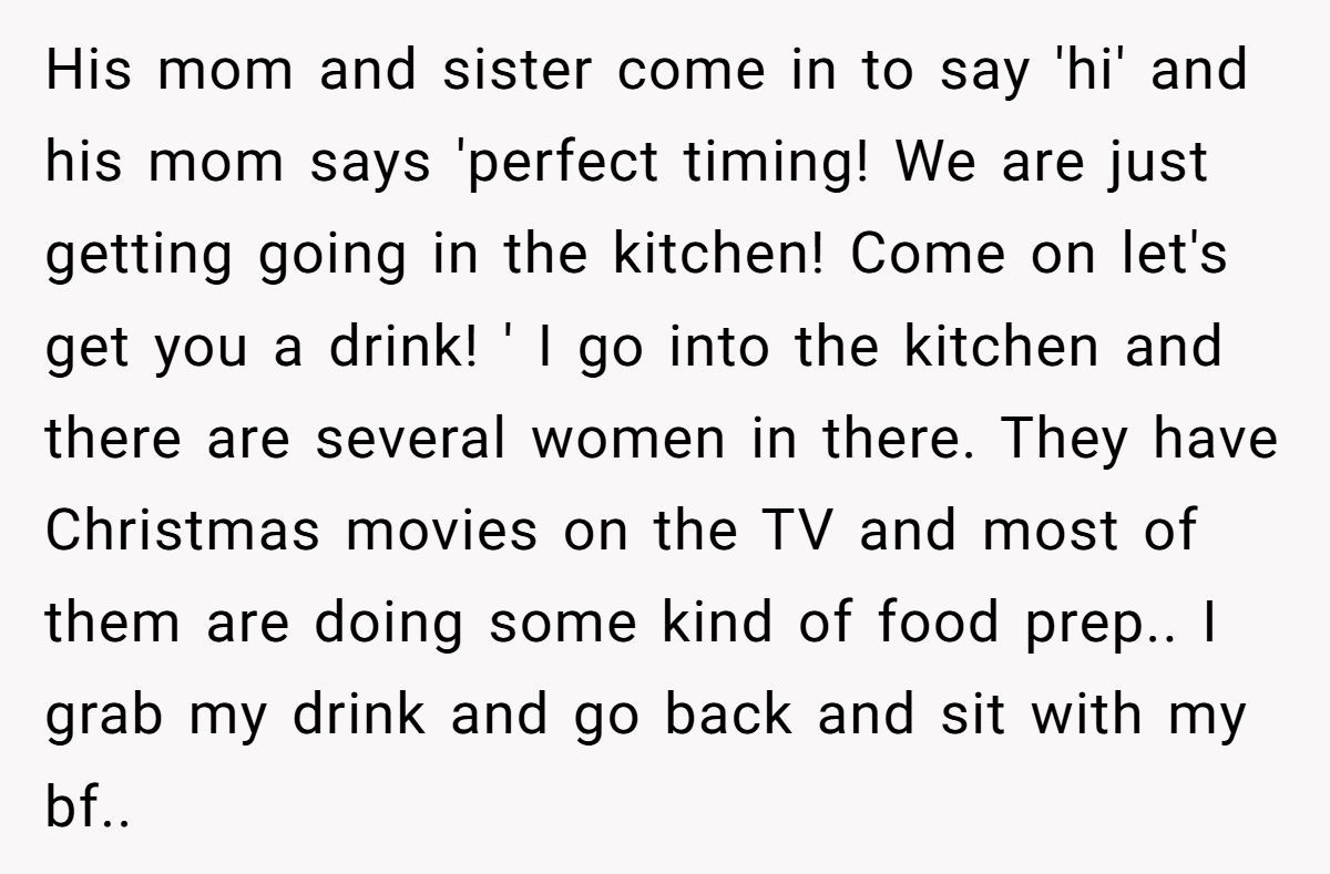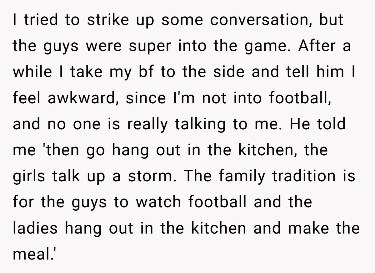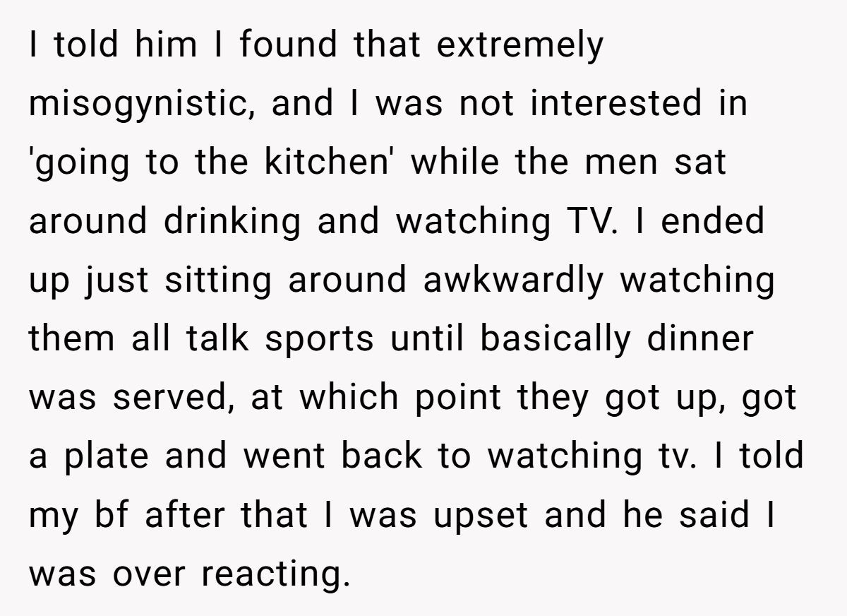 The boyfriend’s family had a holiday habit of splitting by gender: men in the living room, glued to the TV and sports; women in the kitchen, cooking and chatting. When the Redditor resisted falling into the “ladies in the kitchen” mold, her boyfriend brushed it off, dismissing her discomfort as an overreaction. The issue wasn’t the cooking or conversation—it was the expectation.