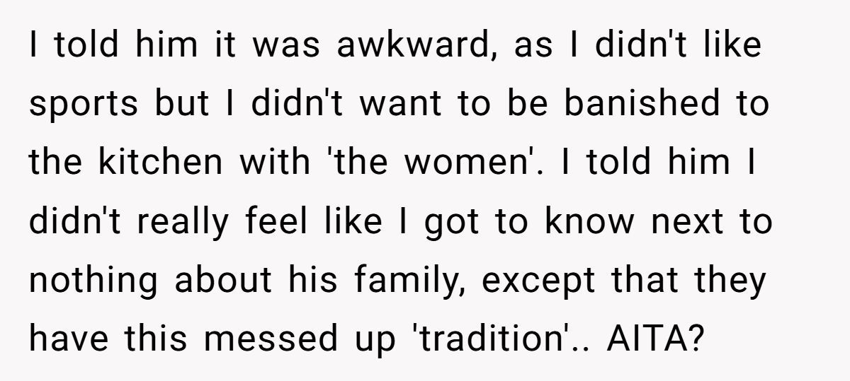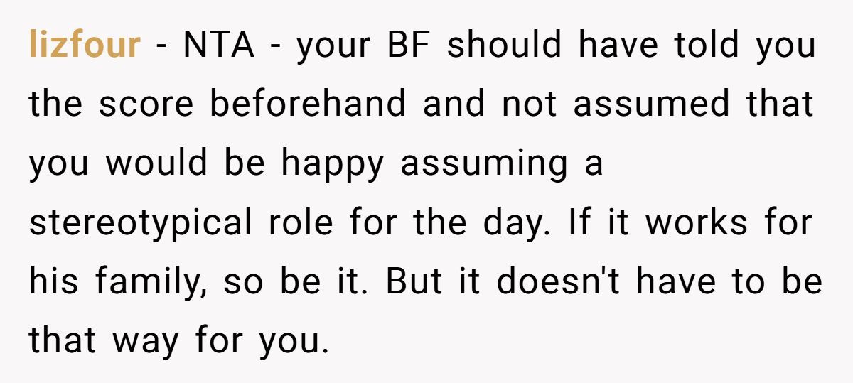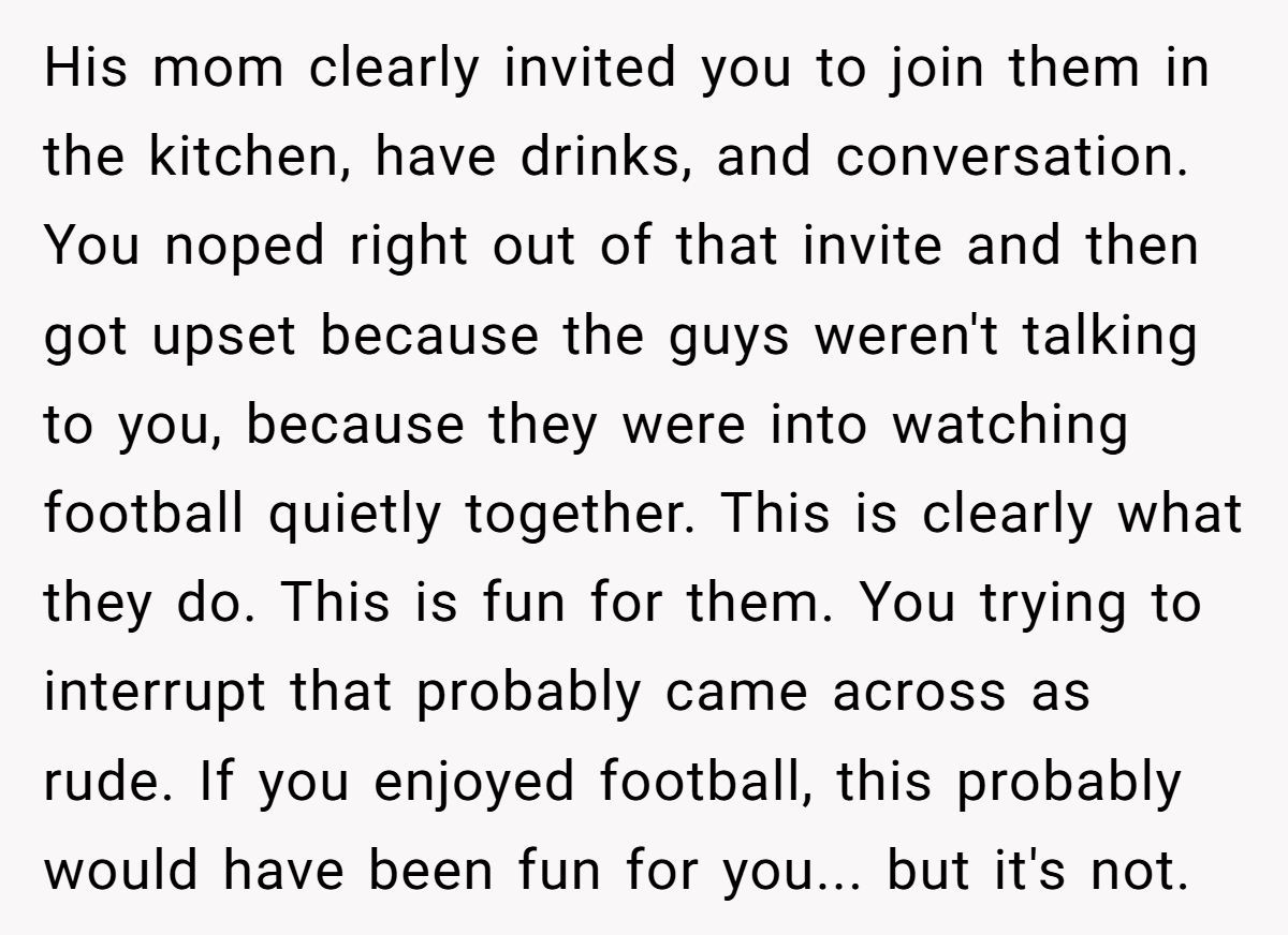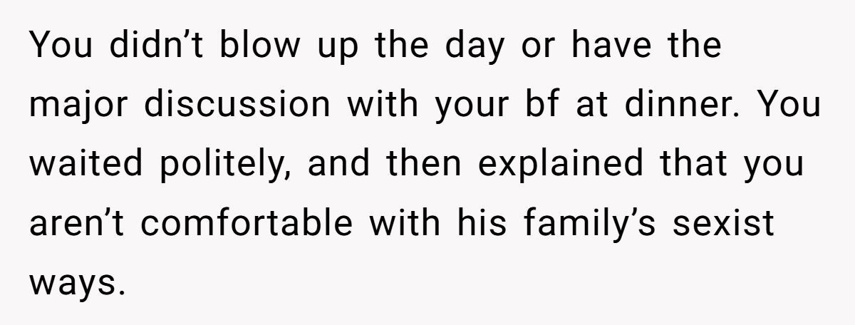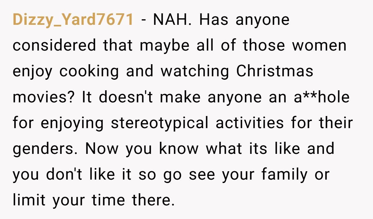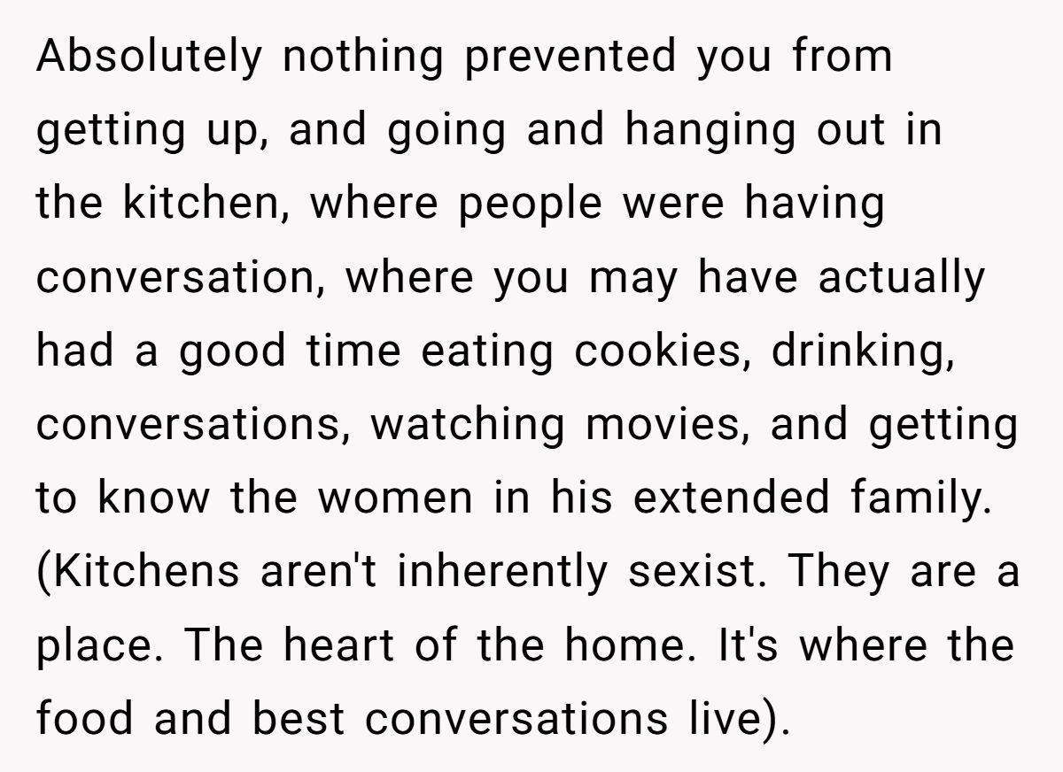 The boyfriend’s family had a holiday habit of splitting by gender: men in the living room, glued to the TV and sports; women in the kitchen, cooking and chatting. When the Redditor resisted falling into the “ladies in the kitchen” mold, her boyfriend brushed it off, dismissing her discomfort as an overreaction. The issue wasn’t the cooking or conversation—it was the expectation.
