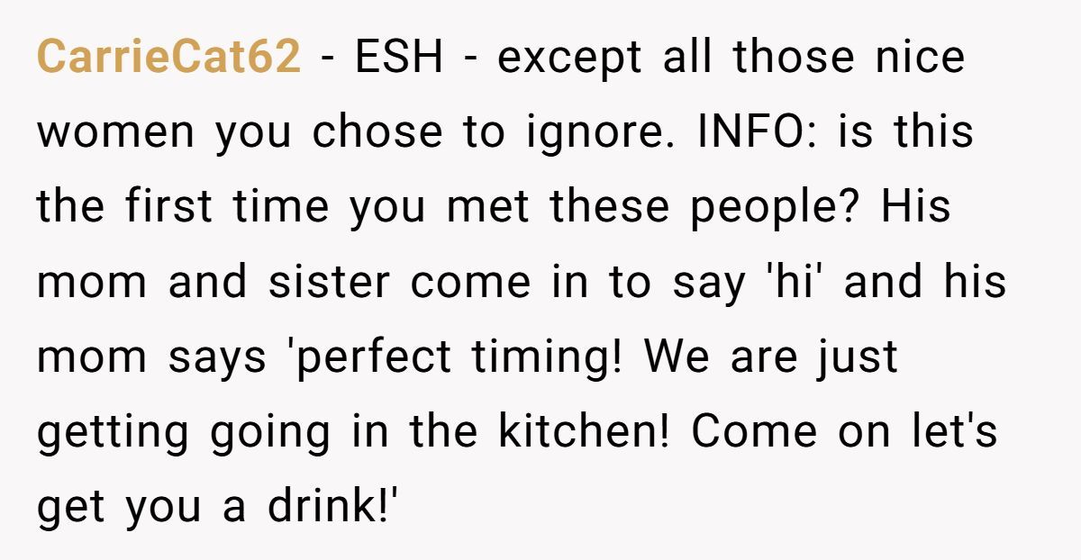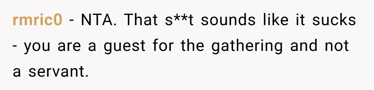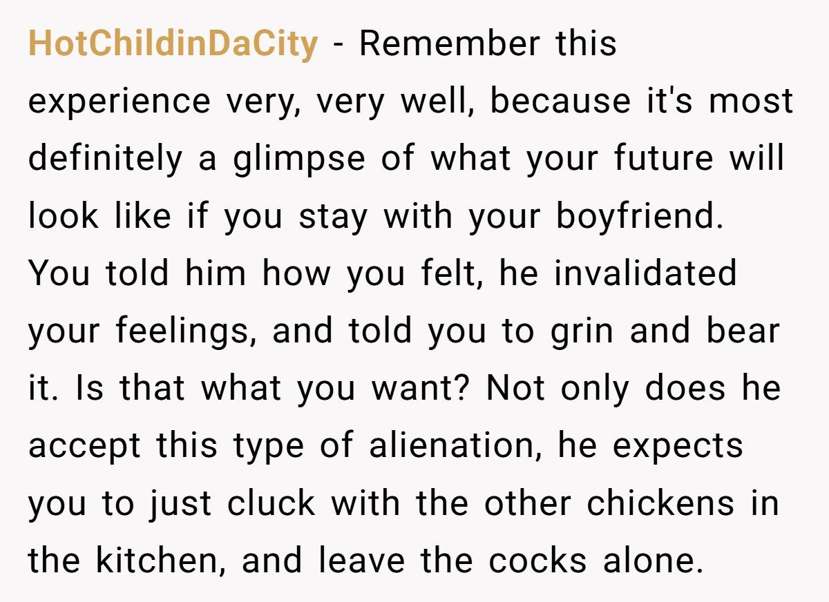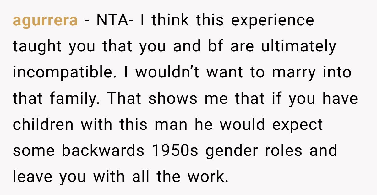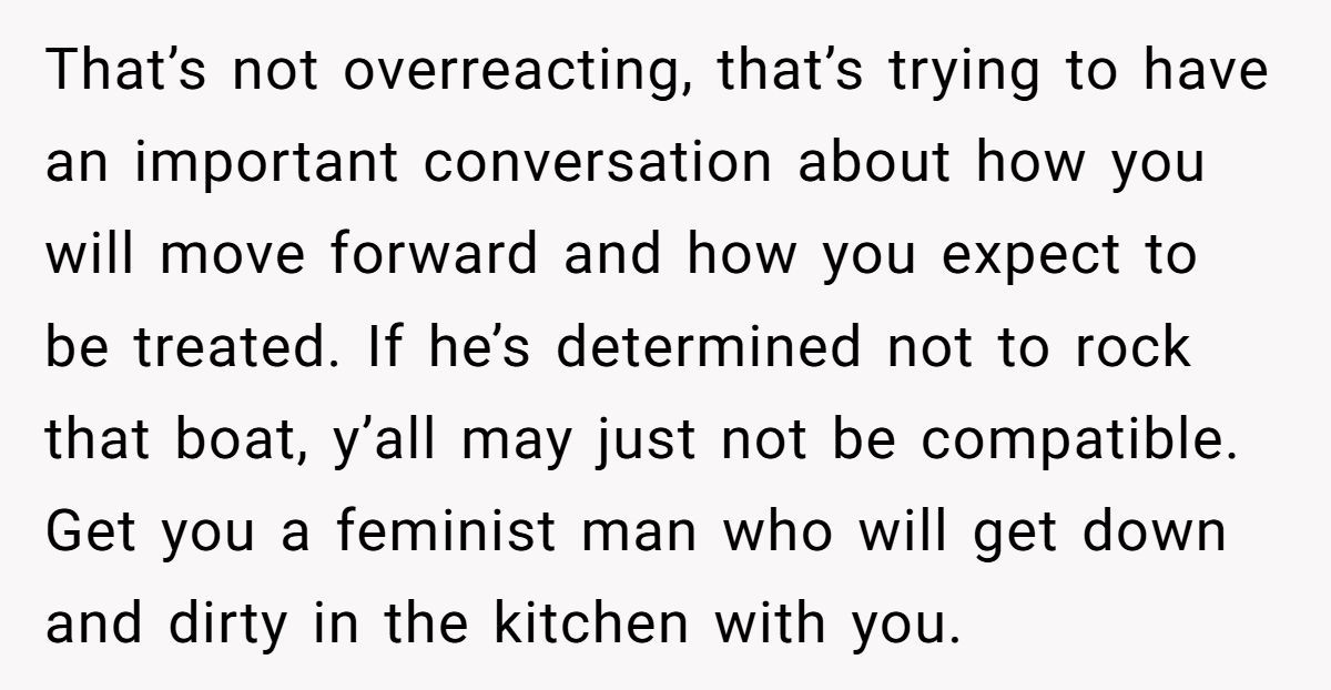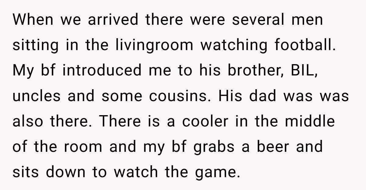 The boyfriend’s family had a holiday habit of splitting by gender: men in the living room, glued to the TV and sports; women in the kitchen, cooking and chatting. When the Redditor resisted falling into the “ladies in the kitchen” mold, her boyfriend brushed it off, dismissing her discomfort as an overreaction. The issue wasn’t the cooking or conversation—it was the expectation.