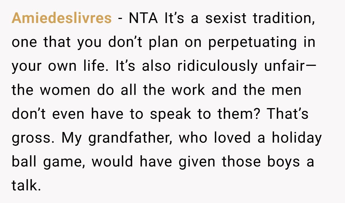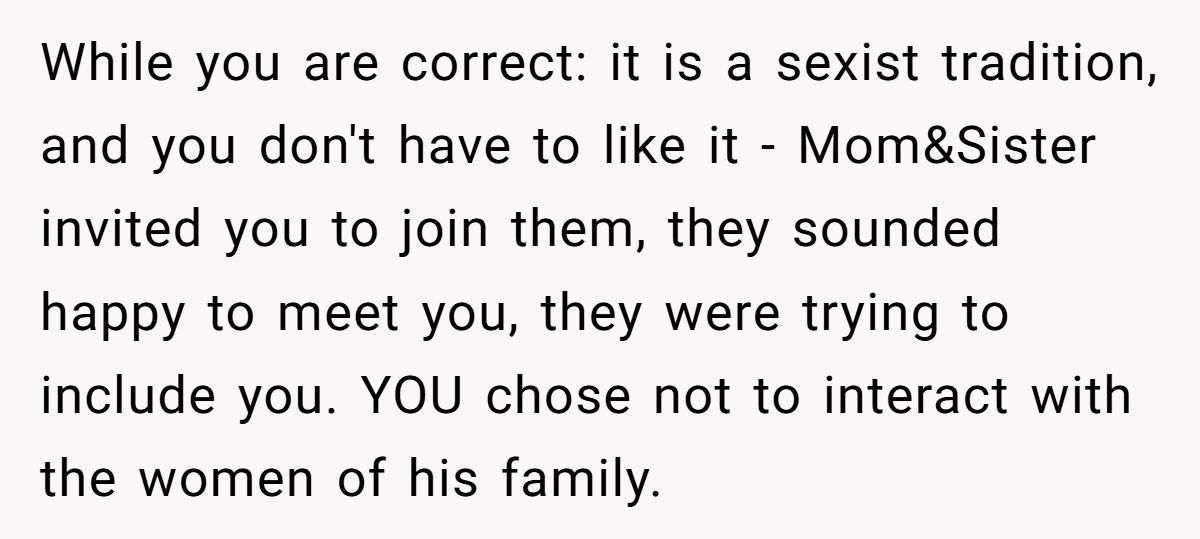 Users argued she could’ve connected with the women in the kitchen, noting her refusal to join them limited her chance to bond, though the tradition itself is flawed