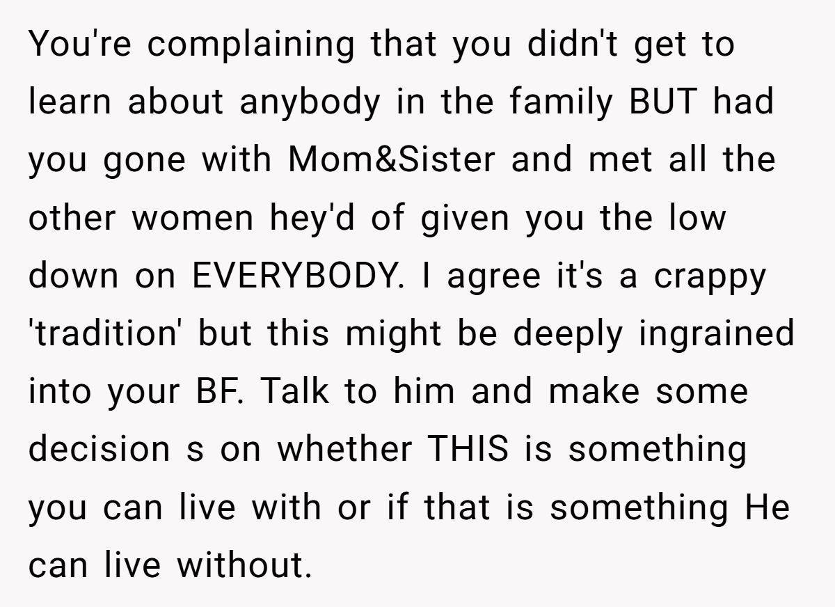 Commenters warned the tradition reflects deeper values her boyfriend may share, predicting future conflicts if they don’t align