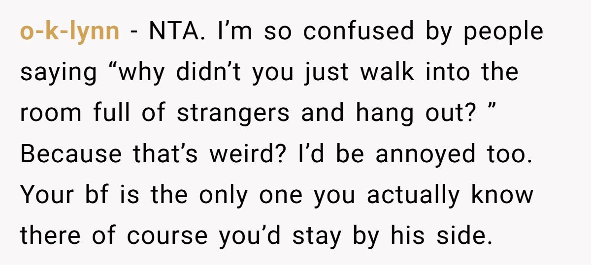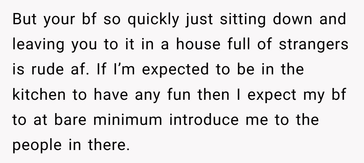 Commenters criticized her boyfriend for not introducing her properly or supporting her discomfort, calling his dismissal rude in a house of strangers