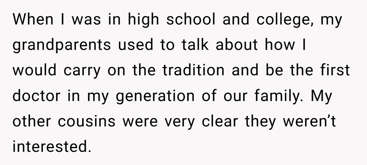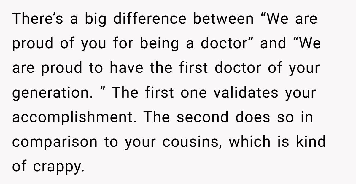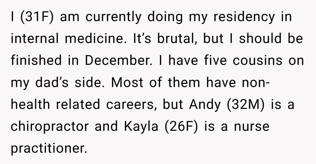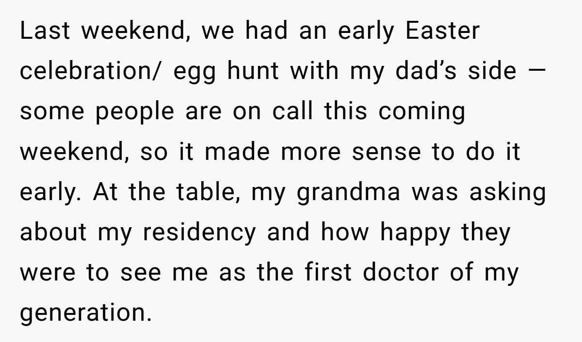 One internal medicine resident shared a story of clashing with her cousins at an early Easter family gathering after her grandma praised her as the first doctor of their generation