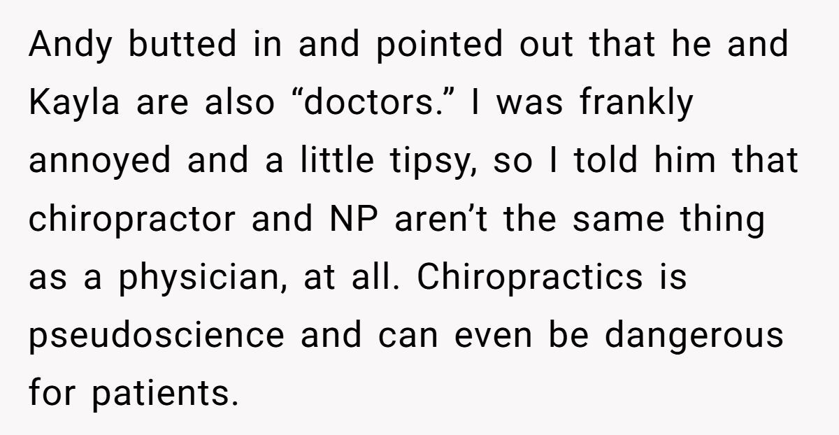 But even if Kayla had a point about systemic bias, airing that frustration at a family lunch wasn’t ideal timing. And Andy, insisting chiropractic is the same as a medical doctorate, probably didn’t help his case either. These things might have been better hashed out over coffee—not in front of Grandma holding deviled eggs.