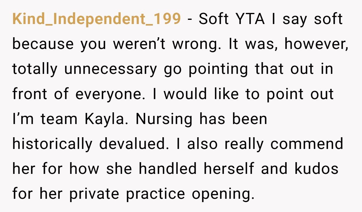 One commenter claimed the Redditor’s point was correct but unnecessary, advising her to applaud Kayla’s practice opening