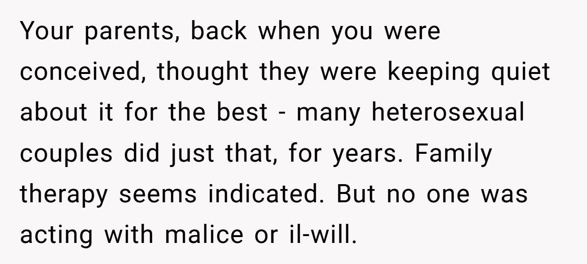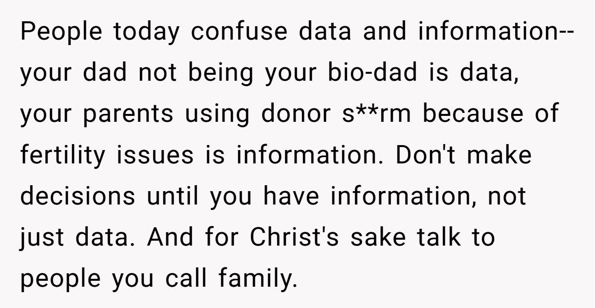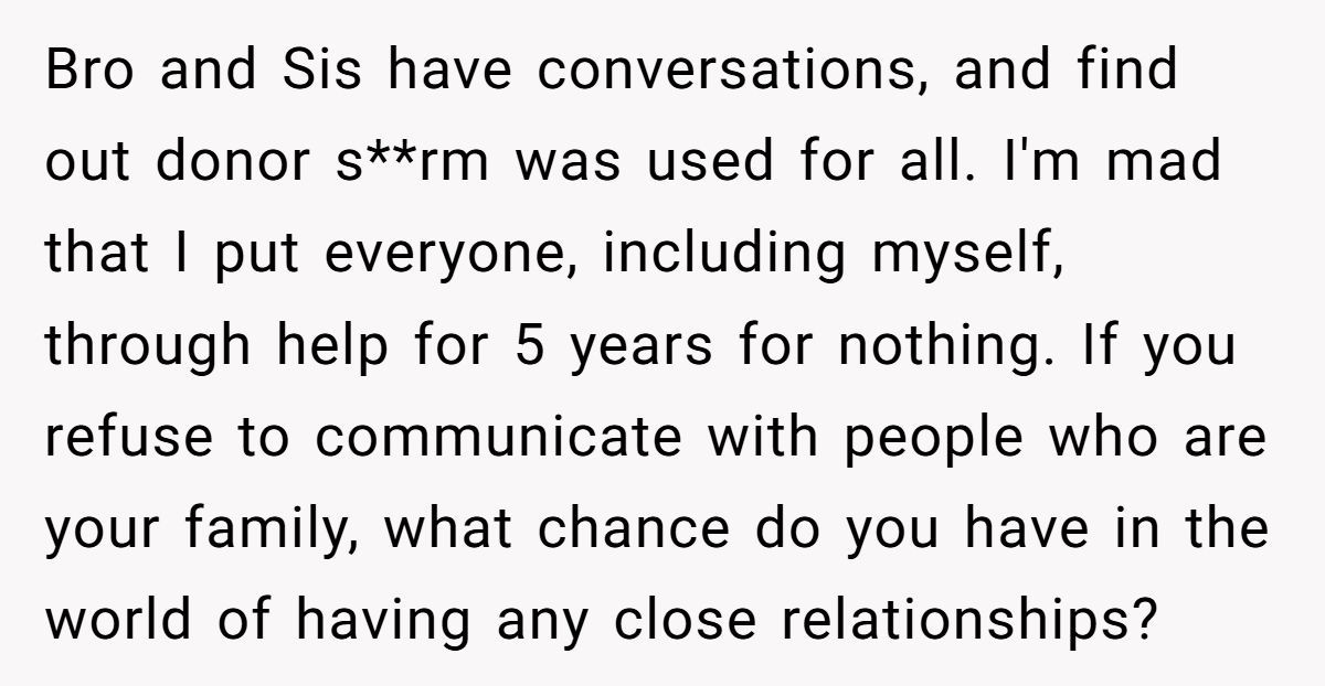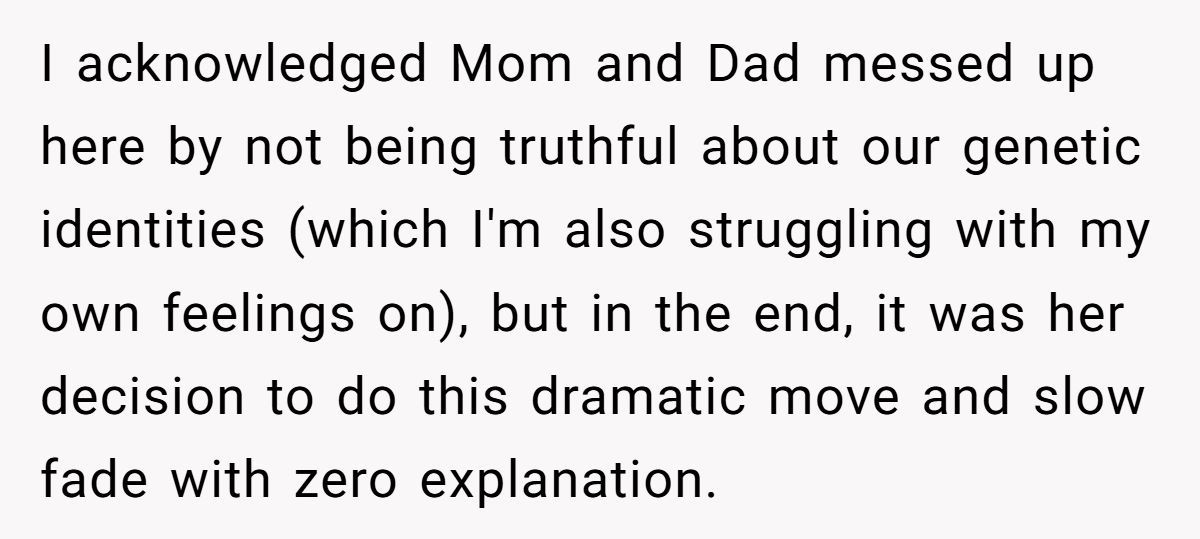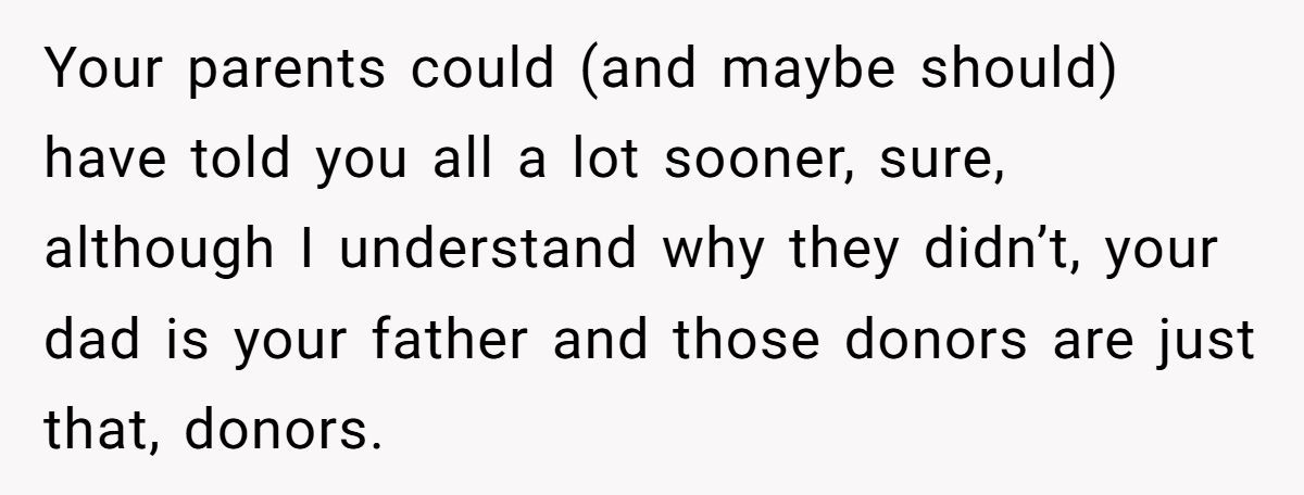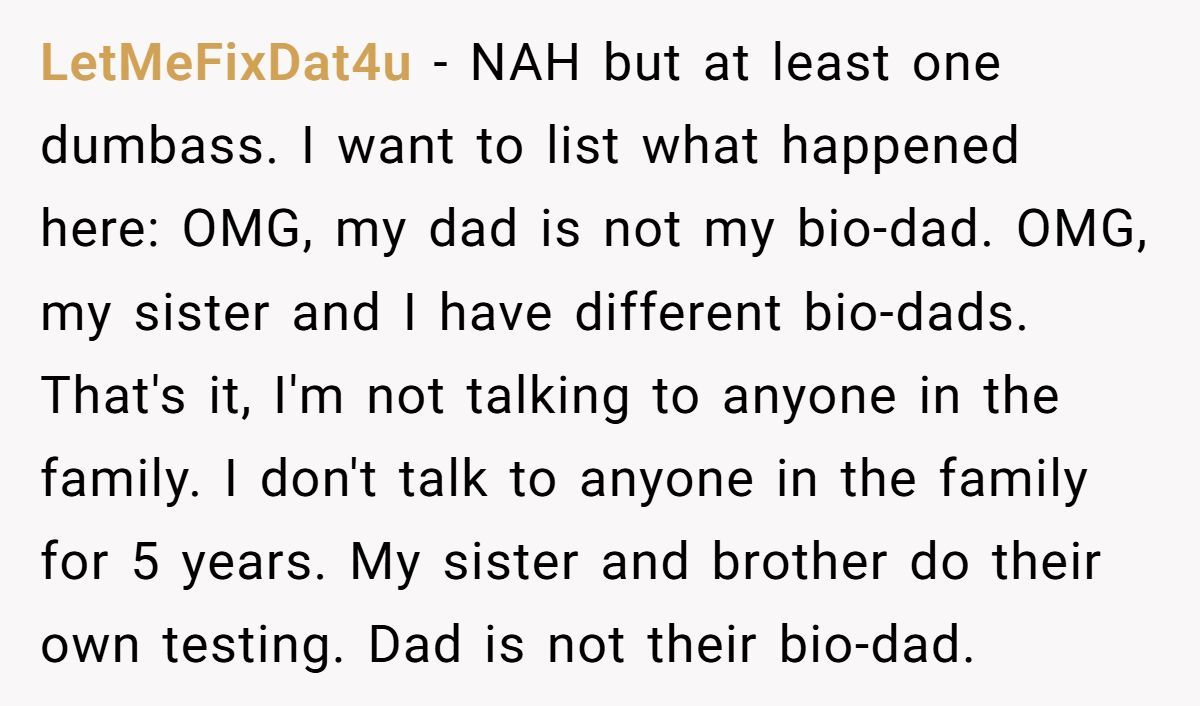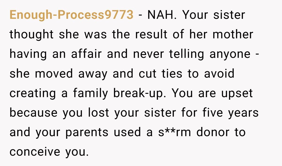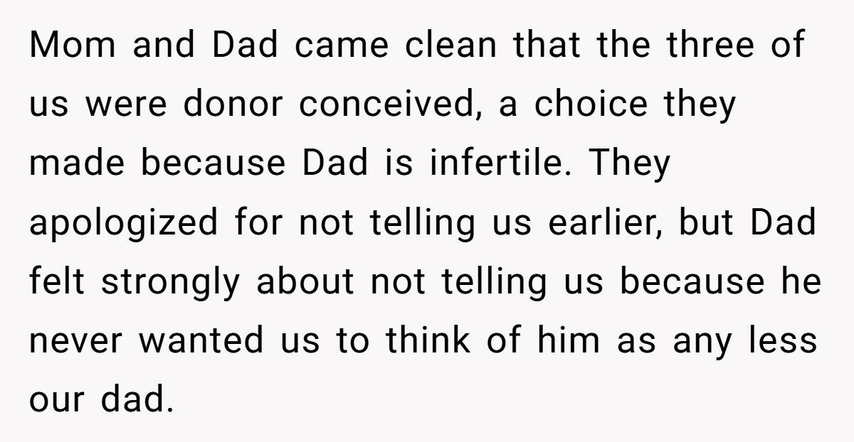 A woman’s sister vanished from their lives after discovering that her dad wasn’t her biological father. But instead of asking questions, she assumed the worst—thinking their mom had an affair—and quietly cut ties with the entire family, even her siblings. Turns out? Everyone was donor-conceived, and the parents had just never said a word.