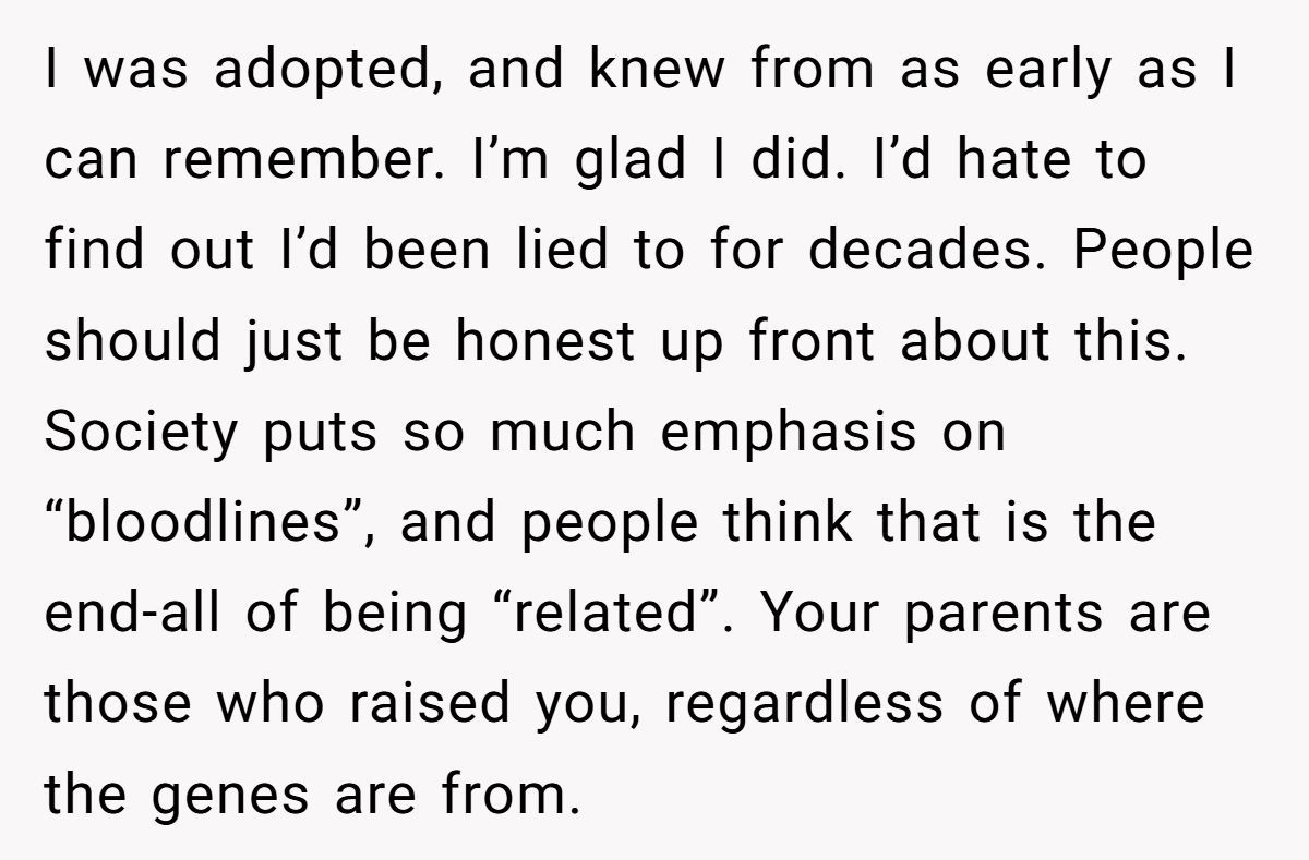 Psychologist Dr. Susan Newman, a specialist in family dynamics, explains that secrets about biological origins “often come from a place of protection, but they can deeply fracture trust.” In this story, the parents withheld the truth to avoid disrupting the family bond. But the silence left room for misinterpretation—and in this case, destruction.