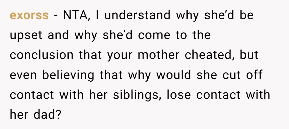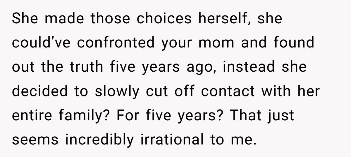 One woman shared a story of telling her older sister that her five-year estrangement from the family was her own fault after she wrongly assumed their mom cheated