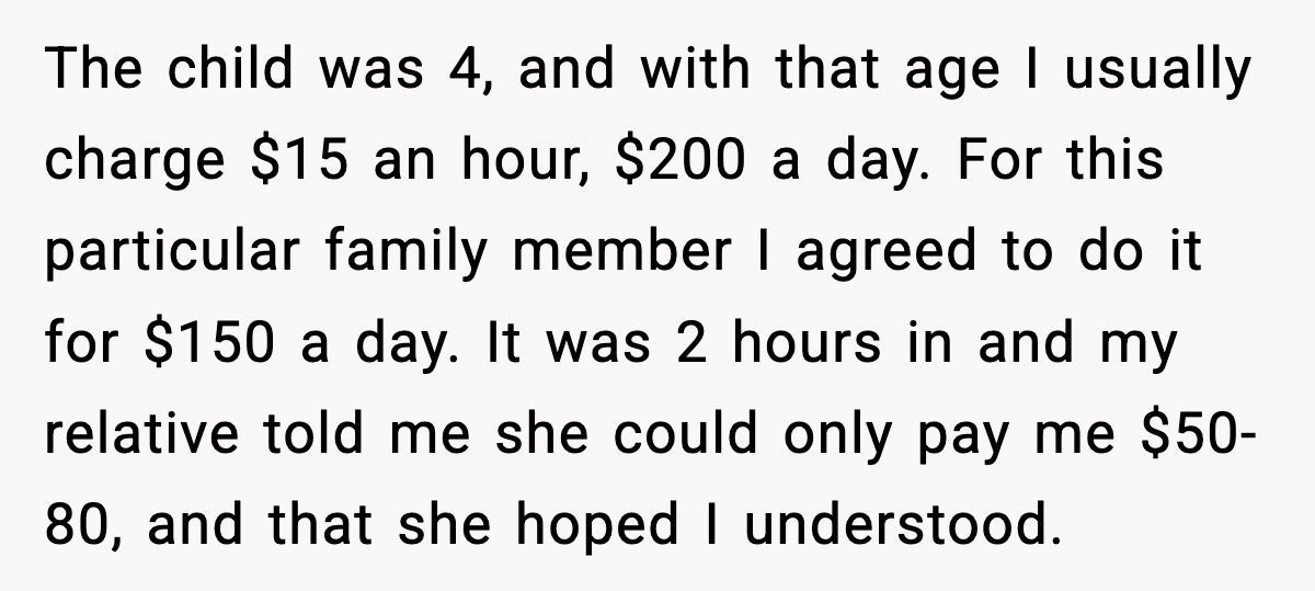 Family jobs can feel like a sitcom gone wrong, but this Redditor’s babysitting gig turned into a boundary-busting disaster! As a professional nanny, she agreed to a discounted $150 daily rate for her relative’s 4-year-old, only to be told mid-job she’d get just $50-$80. Ignored after protesting, she dropped the kid with another relative who agreed to watch them. Her relative’s now slamming her as “selfish,” but was her exit justified?