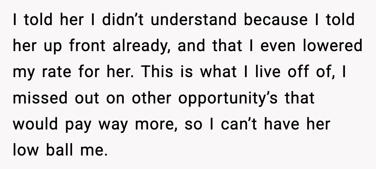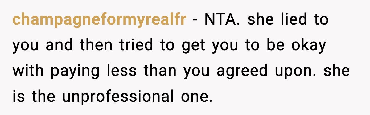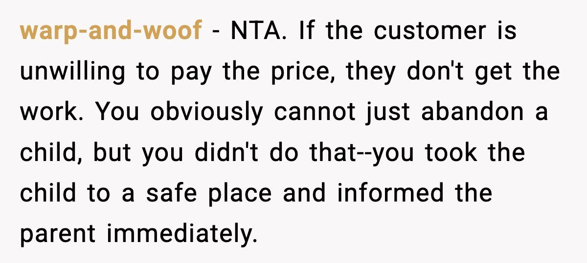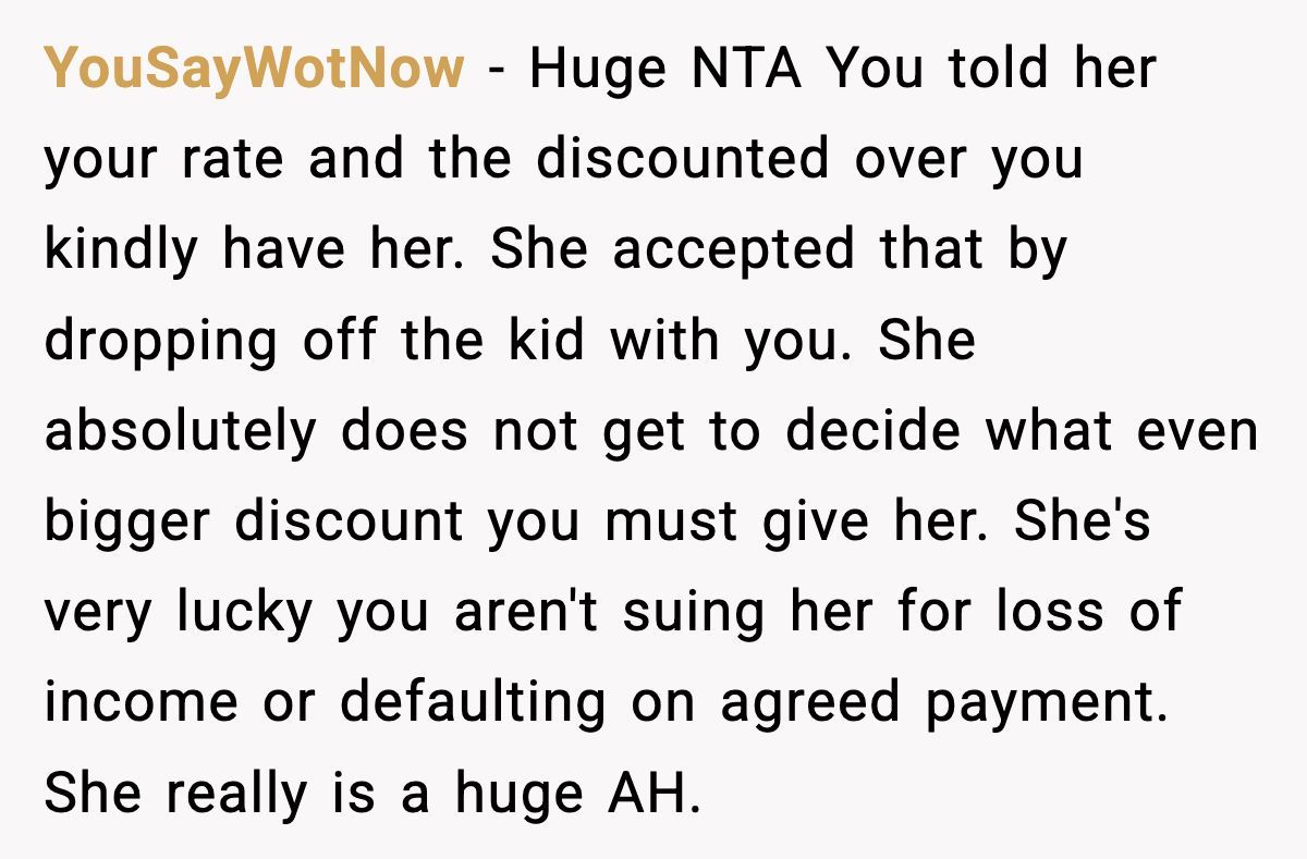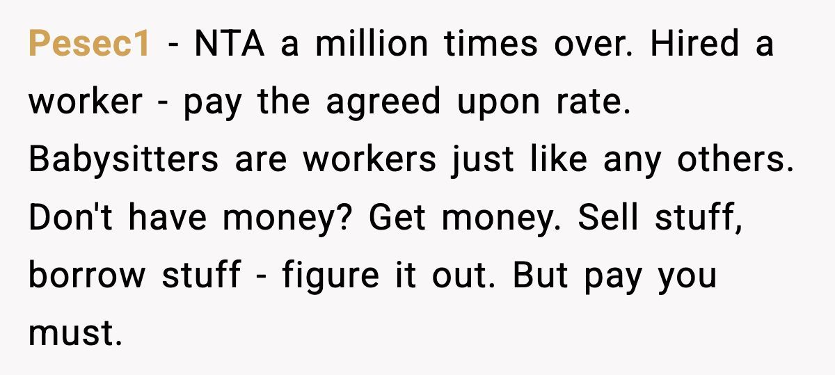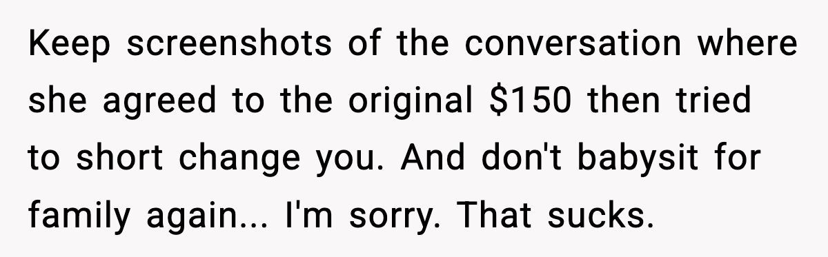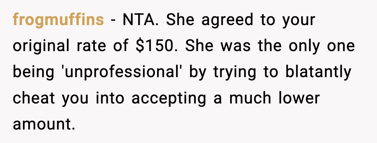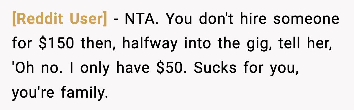 The relative might argue that family should be flexible, especially for a one-time job, and dropping off the kid was dramatic. But trying to lowball a professional rate—after agreeing to $150—and then ghosting her complaints shows blatant disrespect. This wasn’t a favor; it was a paid job, and the Redditor missed other high-paying gigs for it. Her decision to leave the child in safe hands was responsible, not reckless.