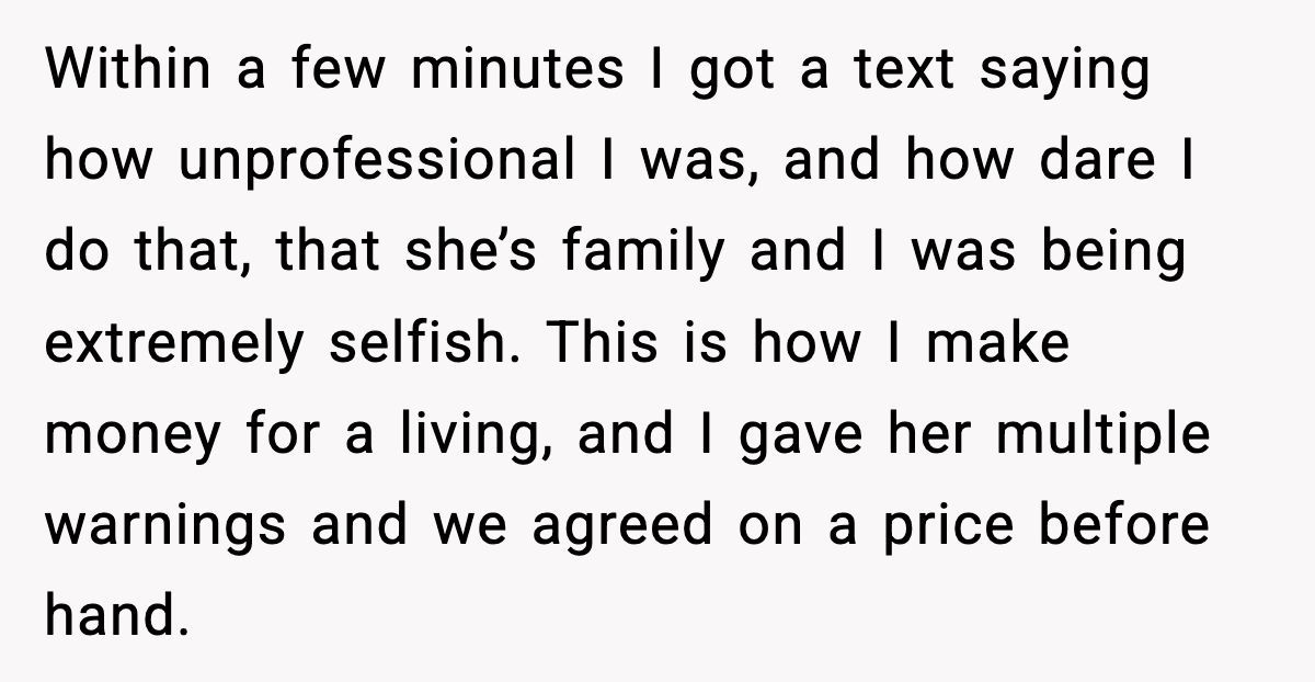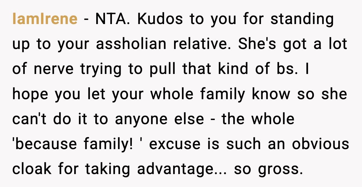 The relative’s “because family” argument was a cheap tactic to exploit the Redditor, who was right to prioritize her livelihood.