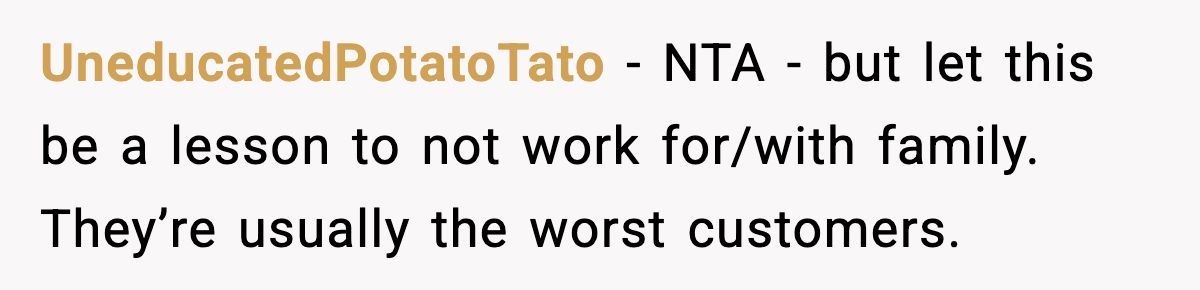 Working for family often leads to trouble, and the Redditor should steer clear in the future to avoid similar disputes
