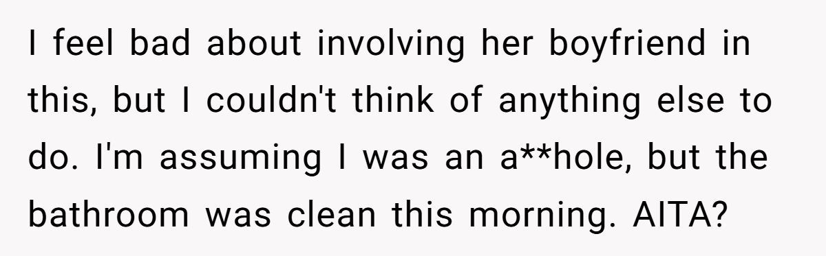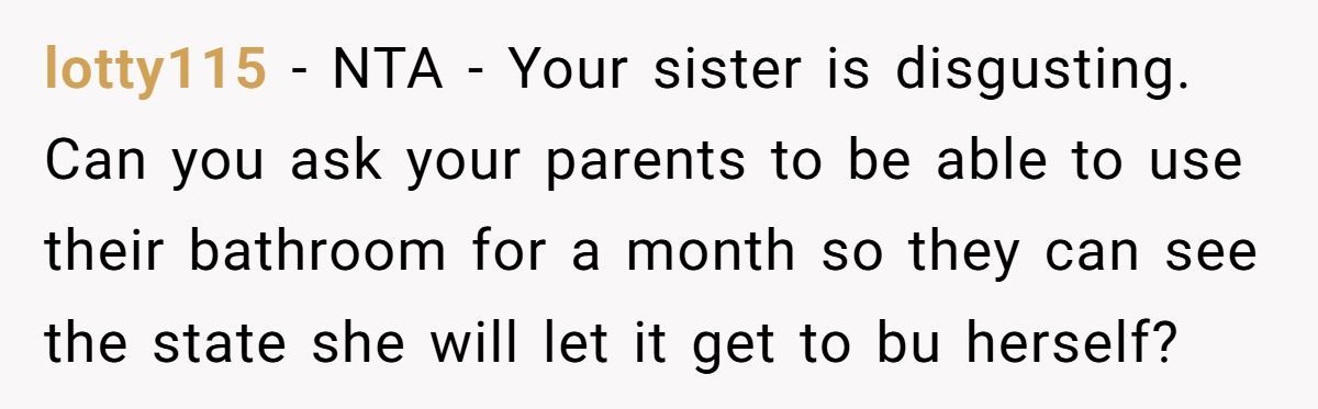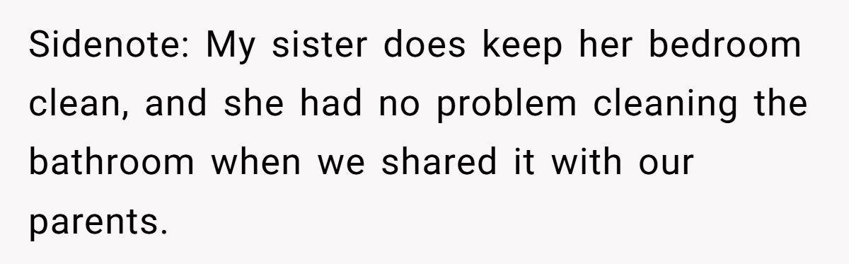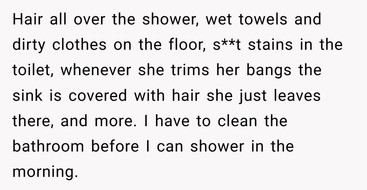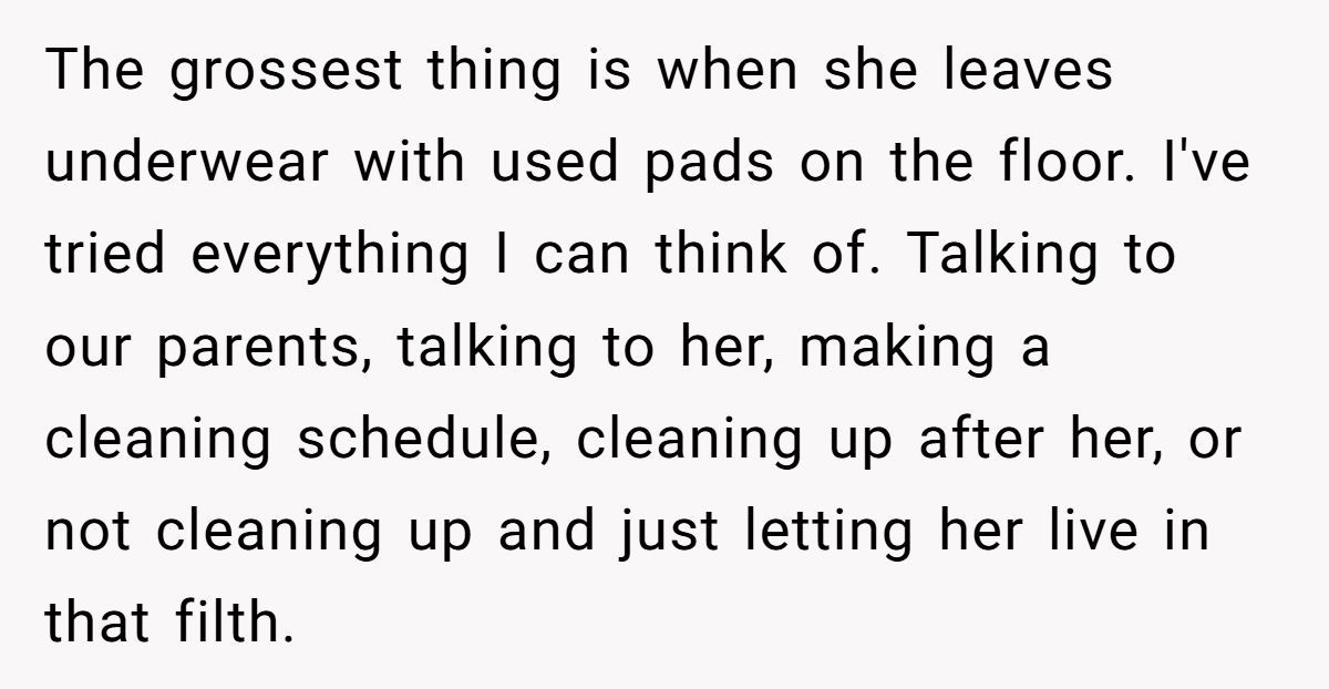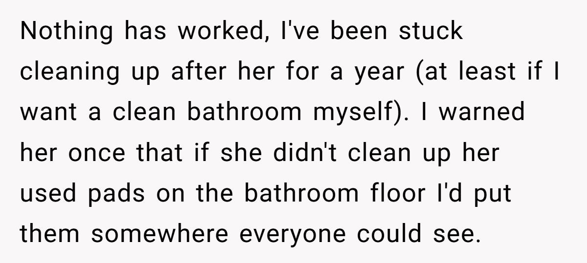 A Redditor walked into a bathroom battlefield that felt less like a hygiene issue and more like a strategic showdown. One sibling had grown fed up cleaning up hair, towels, stains—and worst of all, her sister’s used pads scattered on the floor.