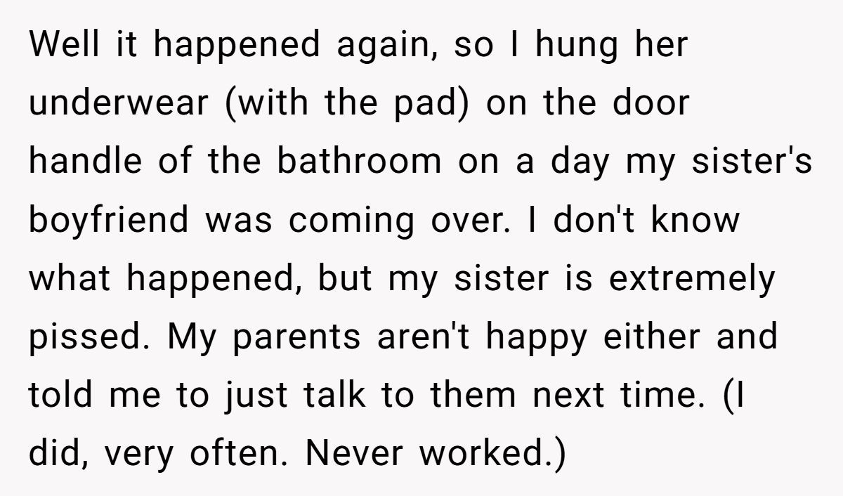 After repeated warnings went nowhere, she hung the soiled underwear on the bathroom door handle—on a day her sister’s boyfriend was visiting. Mom and sister exploded. The bathroom was finally clean, but now the house is war. Want the full scandal? Dive into the original drama below!