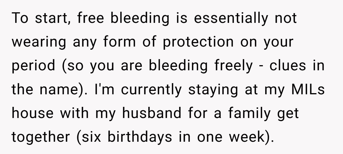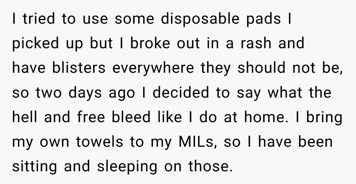 That’s exactly what happened to one Redditor, who shared her story on the AITA forum. She decided to free bleed while staying at her mother-in-law’s house due to an unexpected early period, severe allergies to menstrual products, and chronic pelvic pain. Although she brought her own towels and cleaned up any mess, her MIL was furious and asked her to leave.
