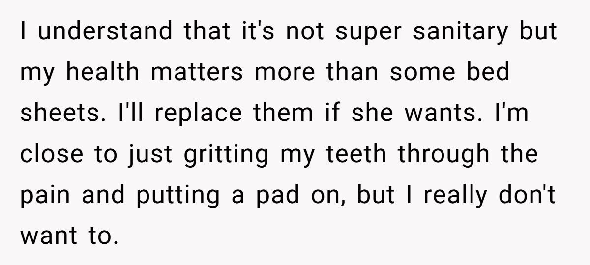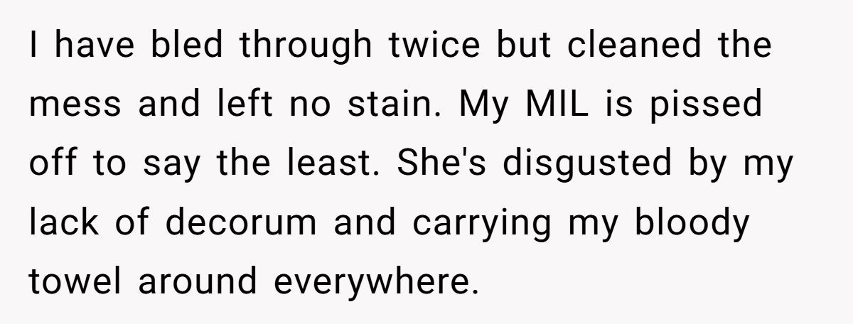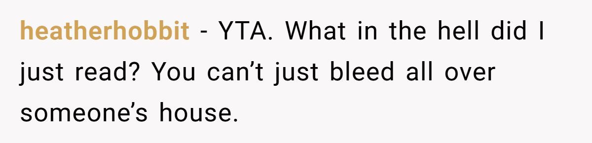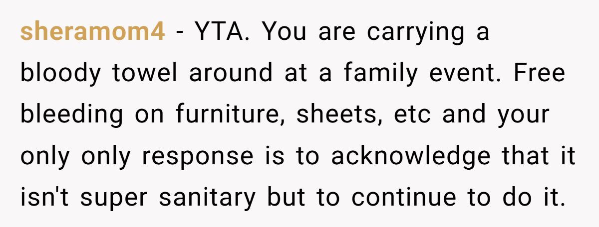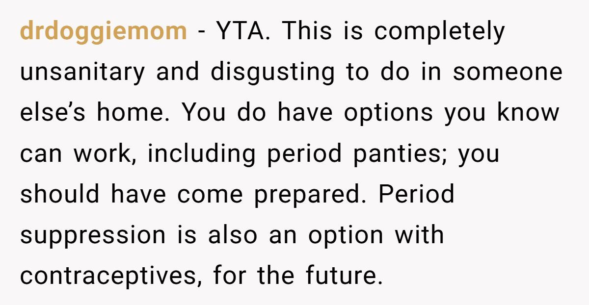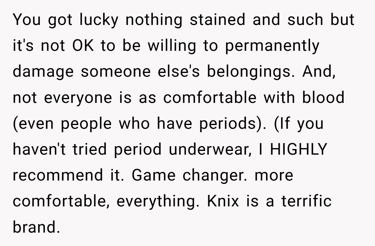 I read this post with equal parts sympathy and secondhand embarrassment. I get what it’s like to feel trapped in your body during a painful period—especially away from home. But walking around someone else’s house with a visibly stained towel? That’s a whole new level of discomfort, for everyone involved.