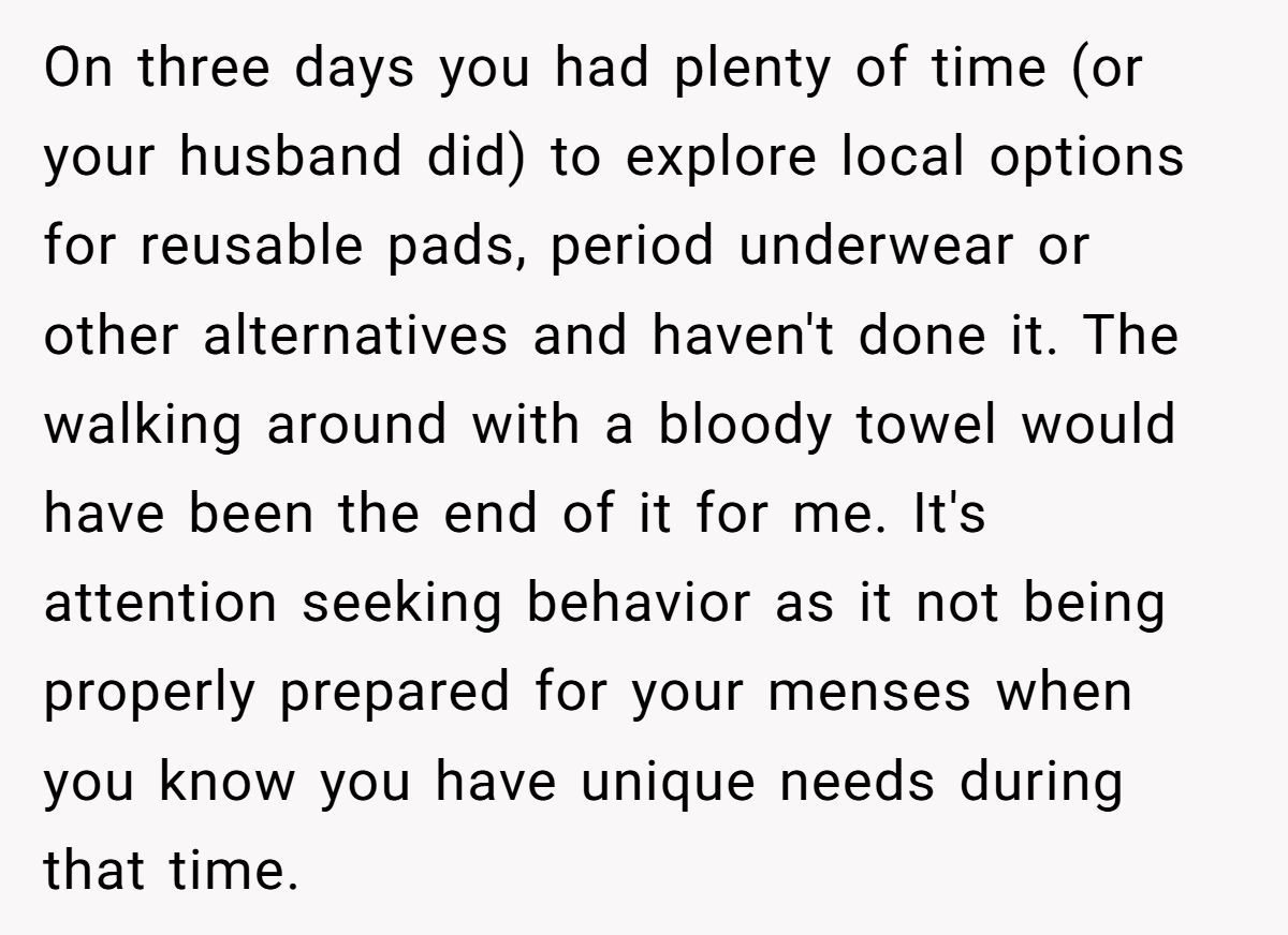 Could this have been avoided? Probably. The internet lit up with advice—from period underwear to menstrual suppression methods—tools that preserve dignity and avoid social friction. Even if her regular cloth pads weren’t enough, her husband could’ve made a pharmacy run. The lack of improvisation struck many as a refusal to compromise.