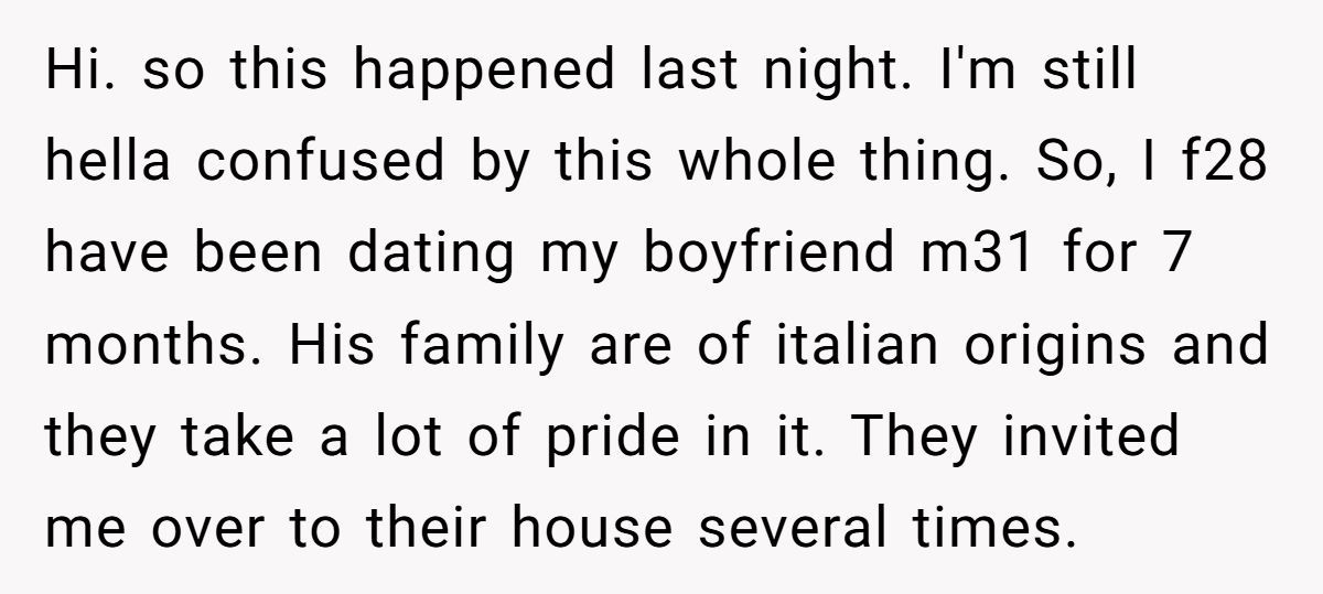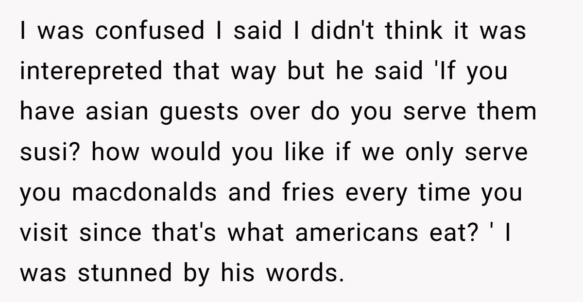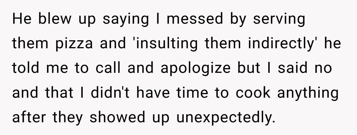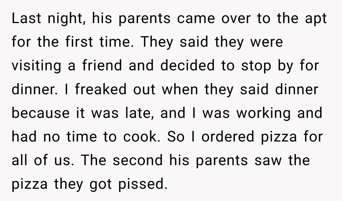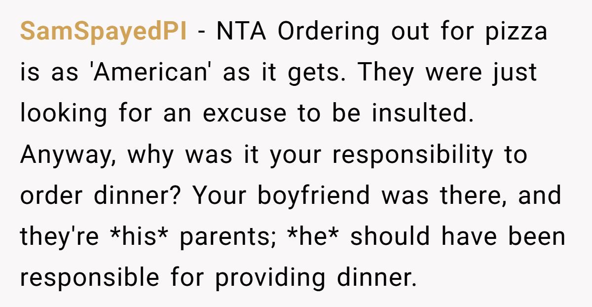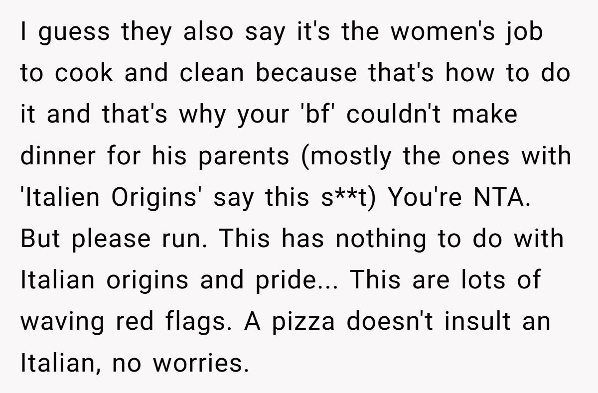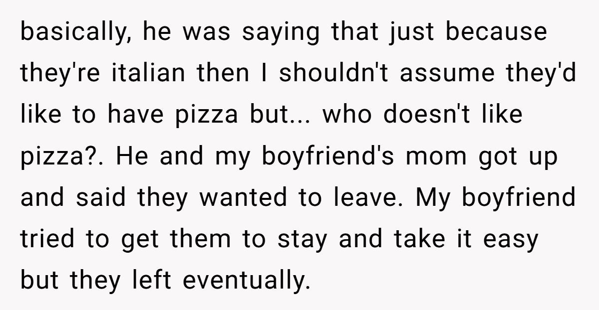 In this case, the woman was thrown into hosting mode last-minute. Her boyfriend’s parents arrived without warning, expecting a full dinner. With no time to cook, she ordered pizza—something widely loved and commonly served to guests in a pinch. But her boyfriend’s father viewed it as a direct insult to his Italian background, equating it with stereotyping. He even made a pointed analogy: would she serve sushi to Asian guests? McDonald’s to Americans?