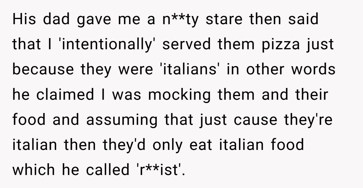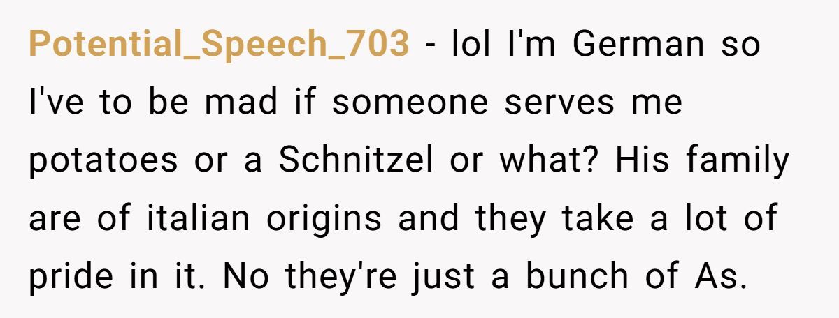If cultural sensitivity was the issue, it could’ve been handled with grace. A lighthearted, “Haha, of course the Italian parents get pizza!” could’ve diffused the tension. Instead, the parents chose offense, and the boyfriend chose blame.