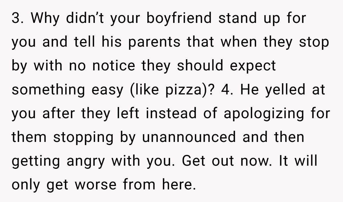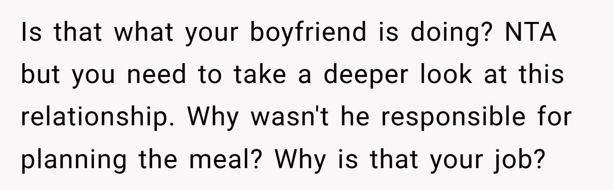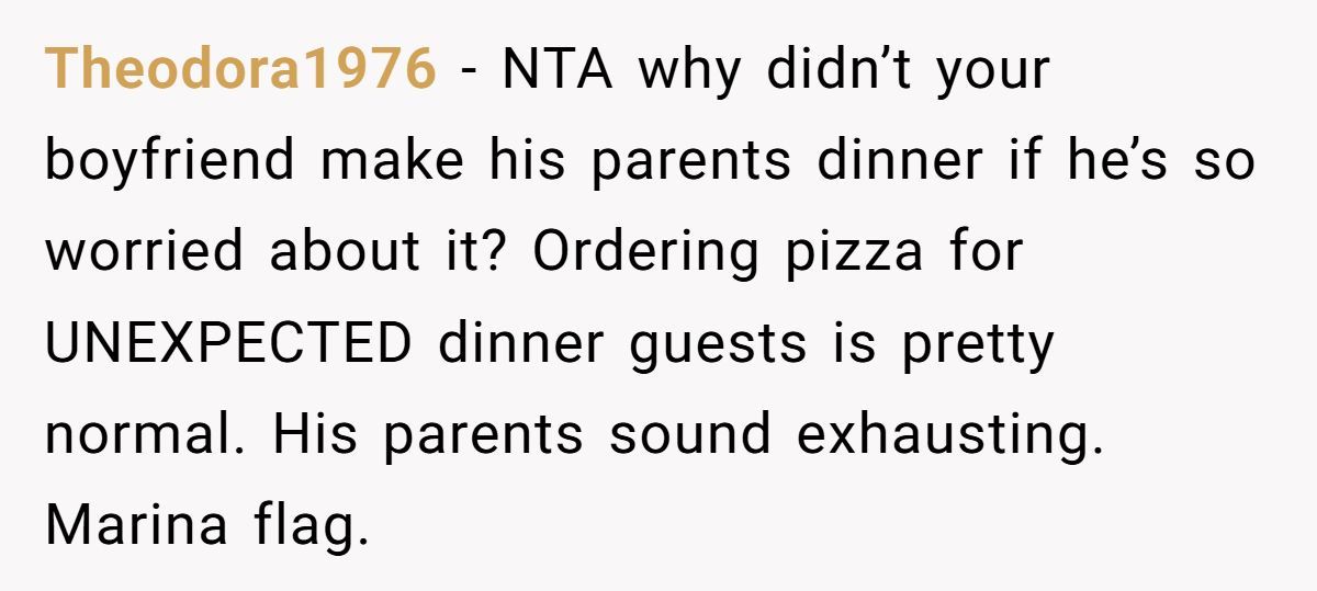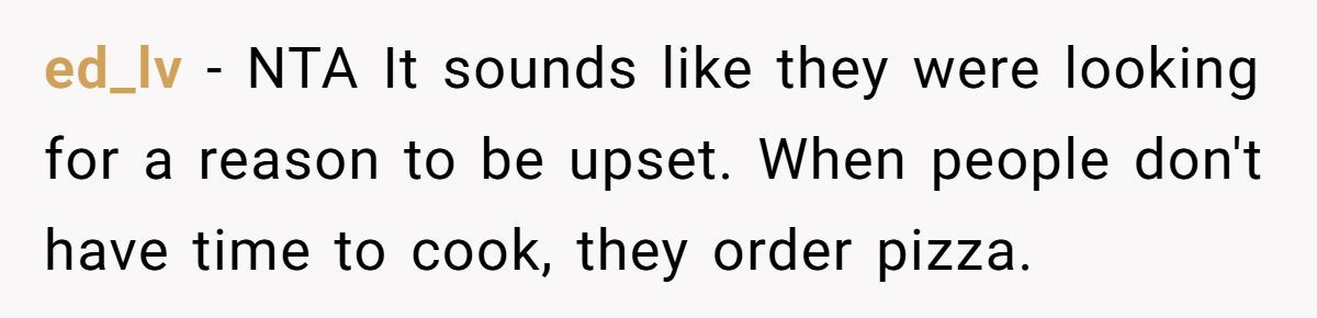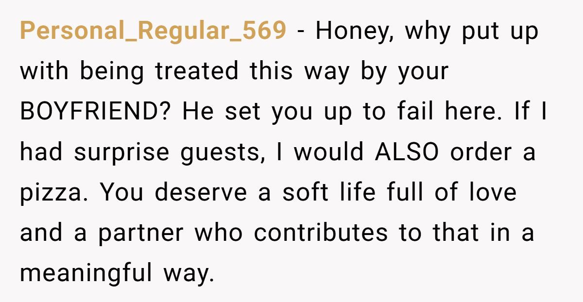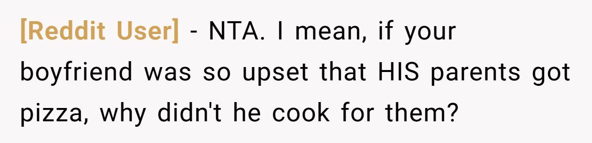 Ultimately, this isn’t about pizza. It’s about respect, communication, and a boyfriend who expected his partner to host, please, and apologize—while he stood on the sidelines. And that, as the comments suggest, is the real red flag.