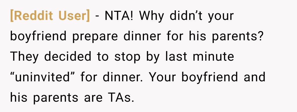 And this Redditor’s boyfriend? He didn’t just fail to support—he escalated. He made no effort to help with dinner, didn’t acknowledge the unannounced visit, and then criticized her reaction. According to a 2022 study by Pew Research Center, 62% of U.S. adults believe that uninvited drop-ins without calling are inappropriate—especially when it comes to expecting a meal.