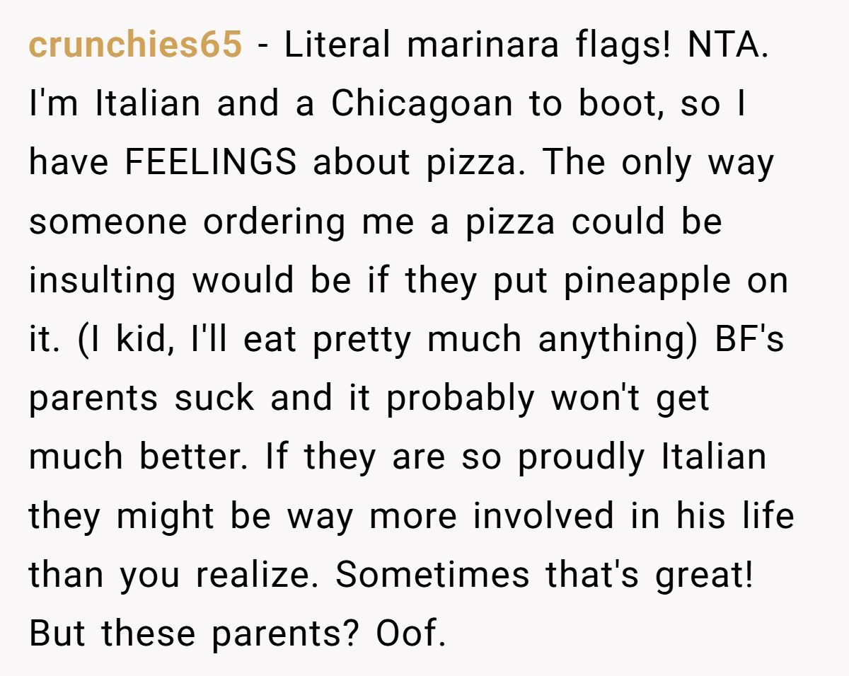 One commenter acknowledged the parents’ pride in their Italian heritage but called their reaction excessive, reinforcing that pizza is a neutral, practical choice