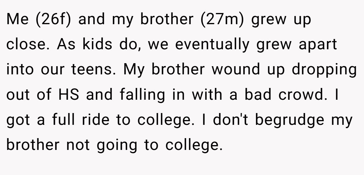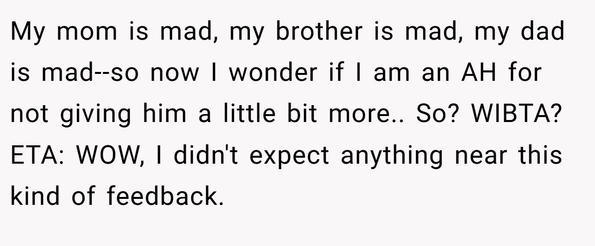 The twist? Her brother hasn’t worked a single day in his life, lives off their parents, and once stole their grandmother’s jewelry to pay for weed. Still, the family believes she should split the money with him to “give him a chance.” Her response? A firm no. So, would she be the bad guy for sticking to her gut? Find out what Reddit had to say below.