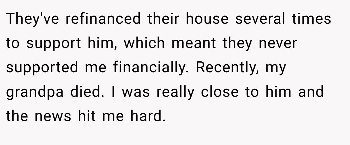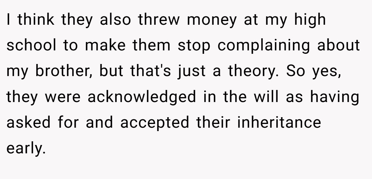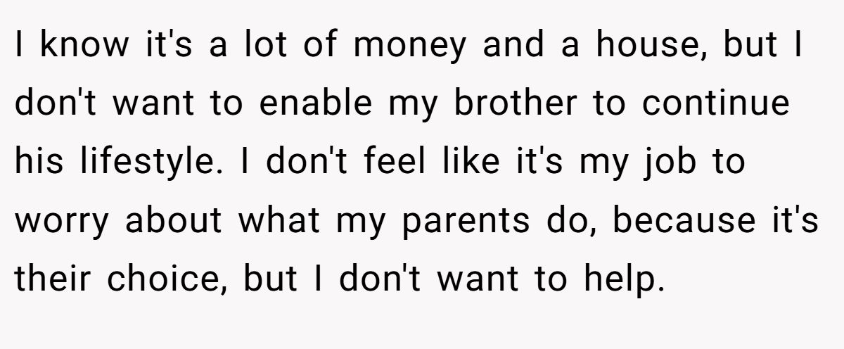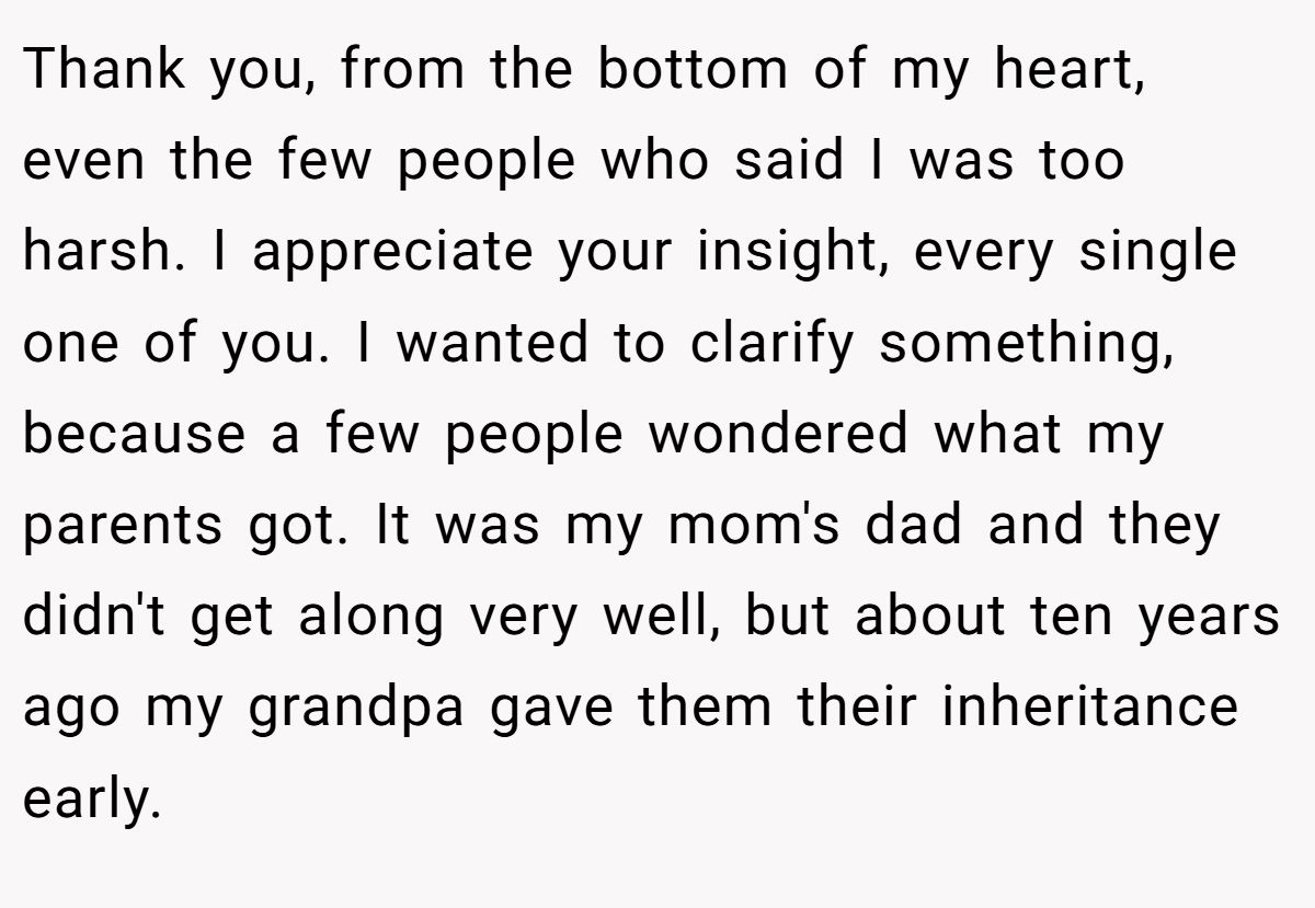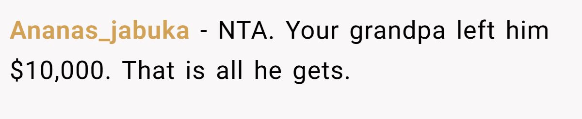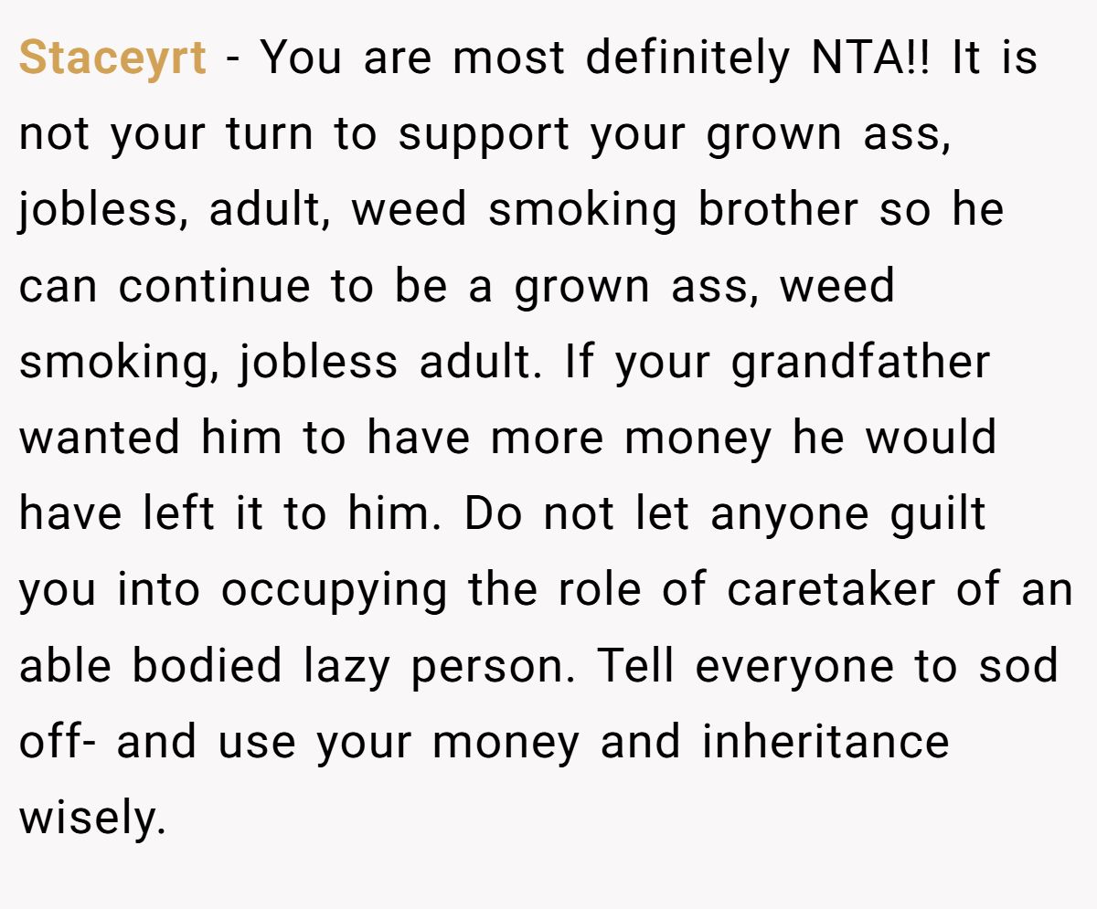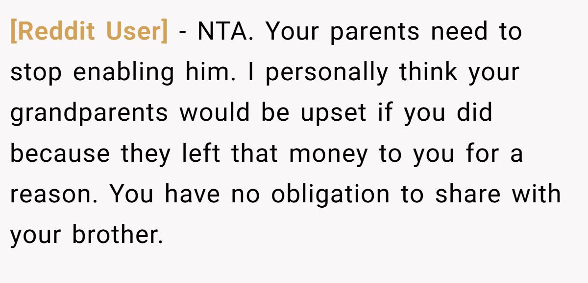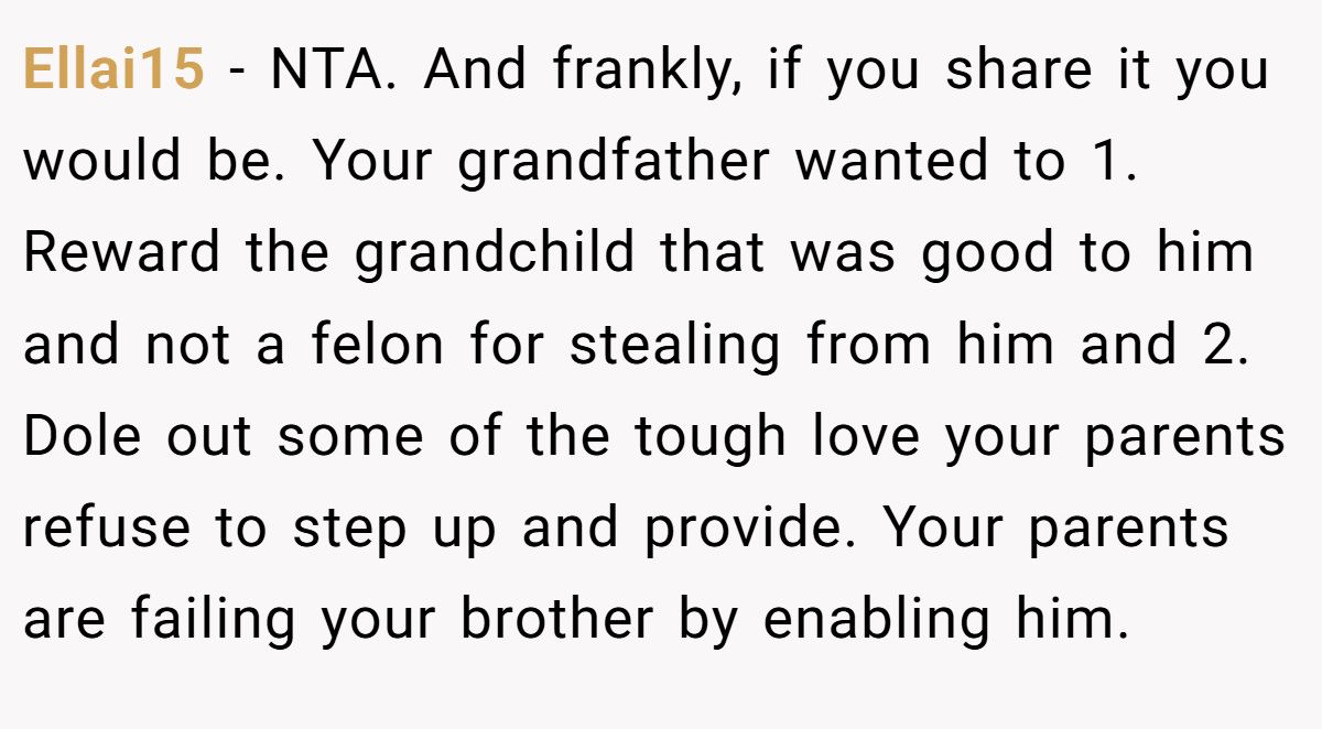 Could she have softened the blow? A calm discussion with her parents about her brother’s need for therapy or job support might’ve eased tensions. Still, her refusal to enable his lifestyle aligns with her granddad’s intent. Neutral advice? Stick to the will, suggest family counseling to address enabling, and use the inheritance wisely for her future. If her brother needs help, point him to professional resources, not her wallet. What do you think—selfish or sensible?