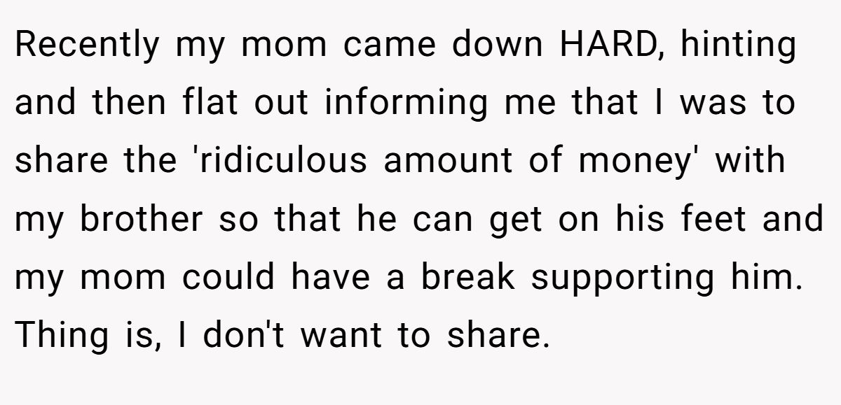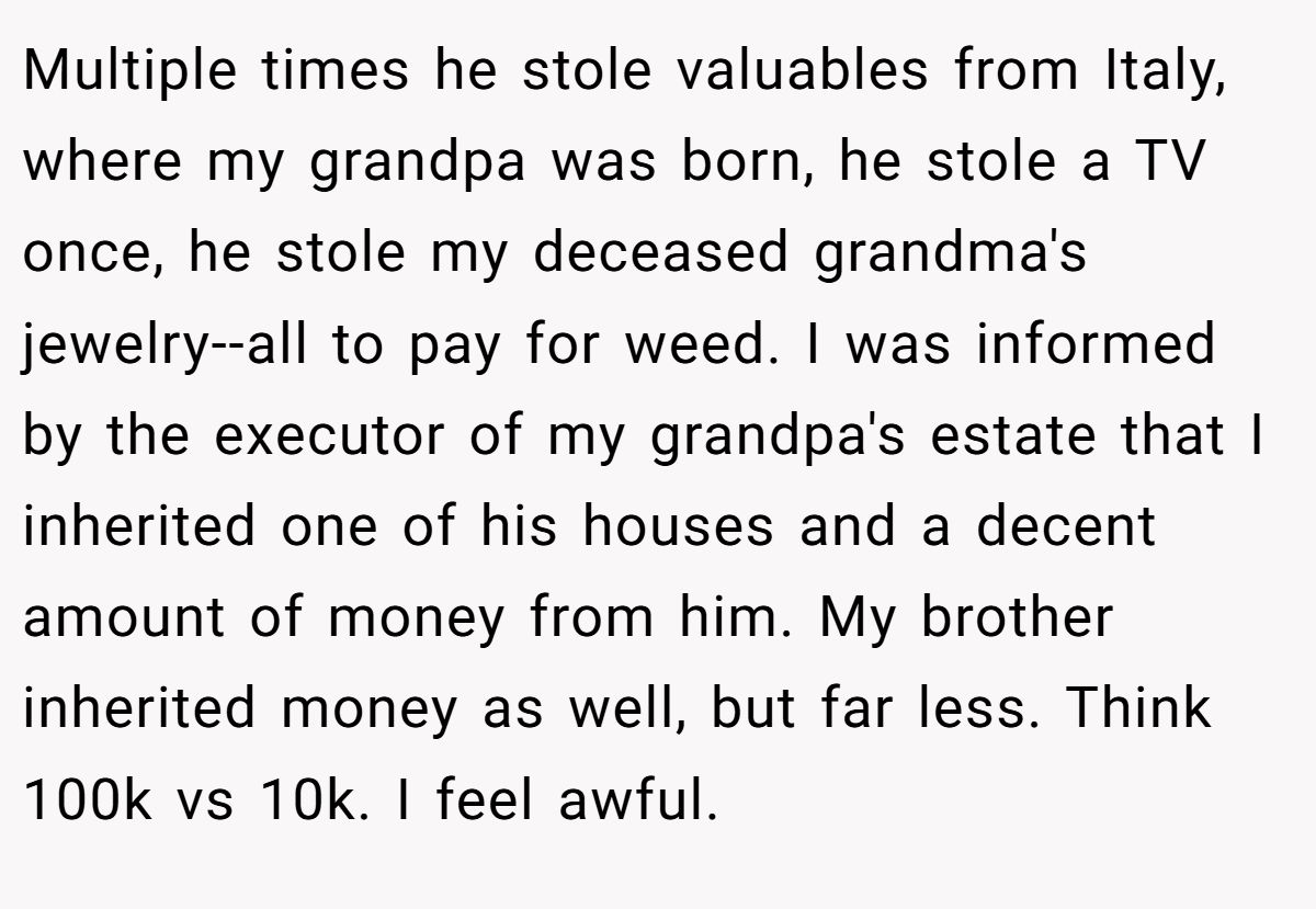 Talk about an inheritance that’s more drama than dollars! OP’s windfall—a house and significant cash—became a family flashpoint when her mom pushed her to share with her unemployed brother, who’s been coasting on parental support. Her refusal, rooted in his history of stealing from their granddad, has everyone fuming. Is she right to hold firm, or should she cut her brother a break?