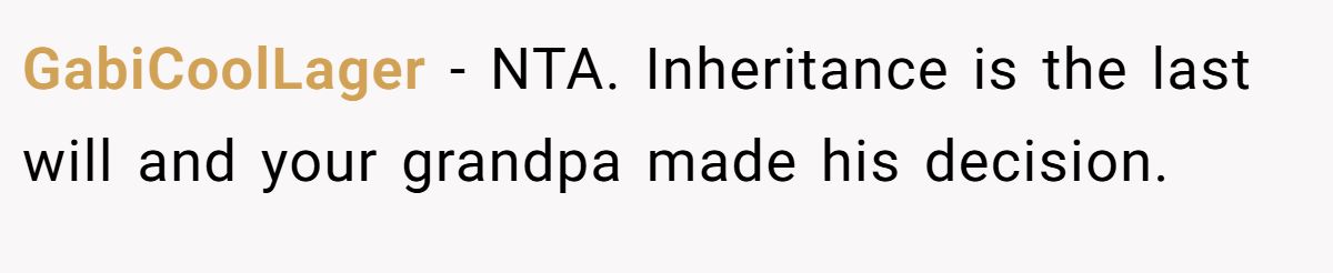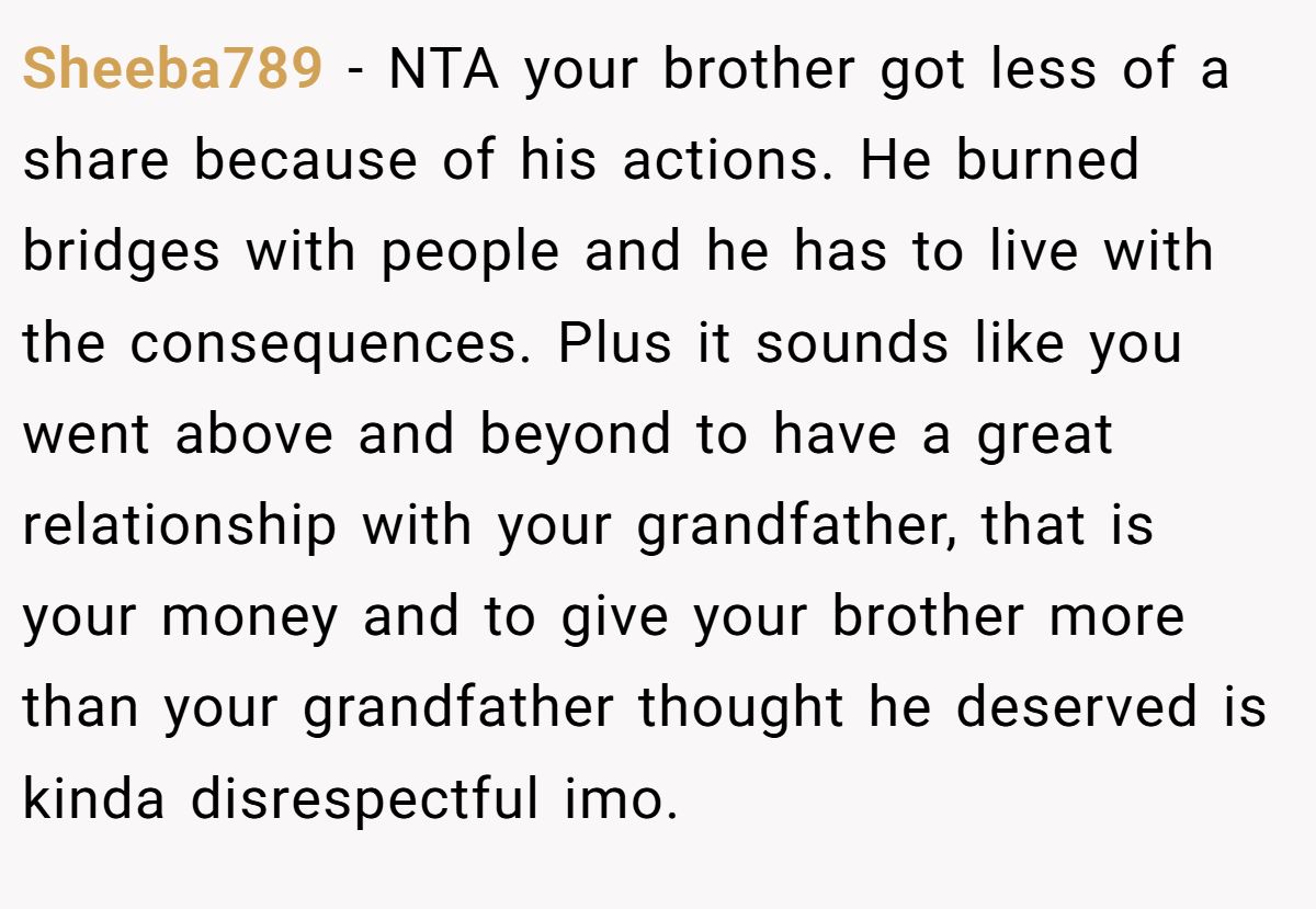 This Redditor praised her for honoring her granddad’s wishes, noting her brother’s actions earned his smaller share.