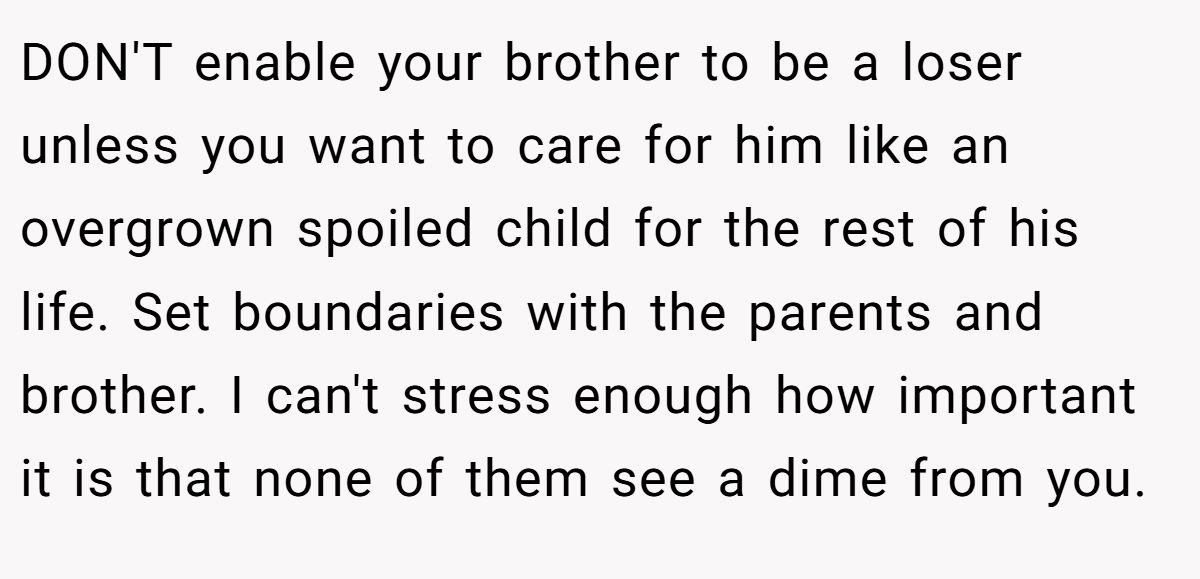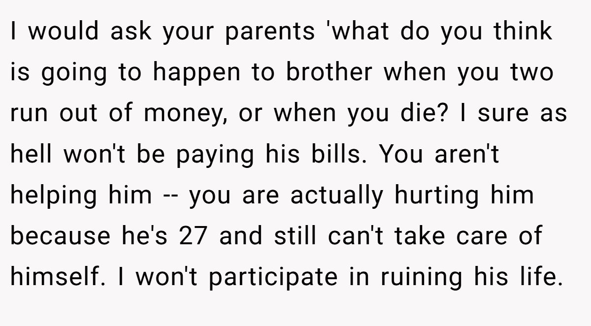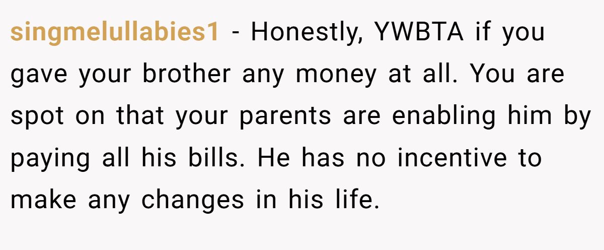This commenter warned giving money would harm her brother, urging her parents to stop enabling.