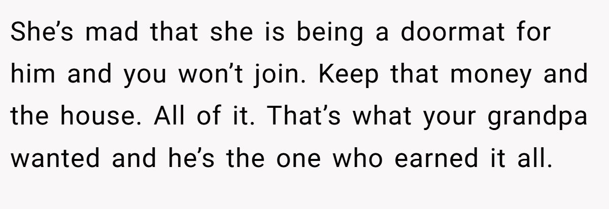 This user warned sharing would enable her brother’s laziness, disrespecting her granddad’s intent.