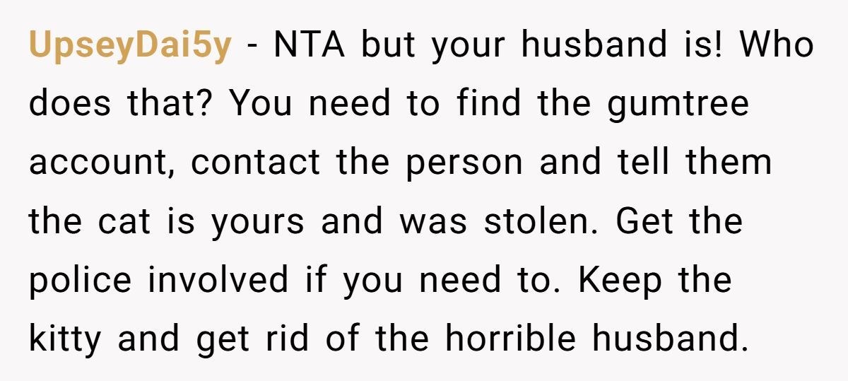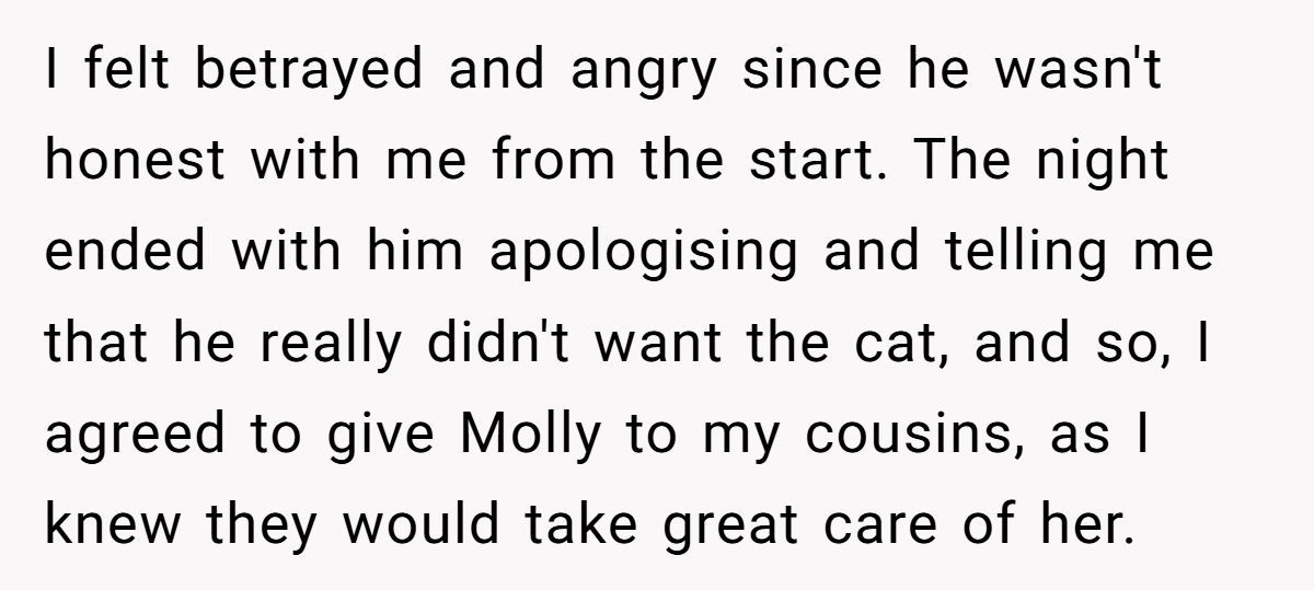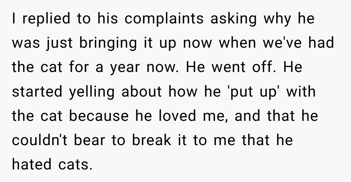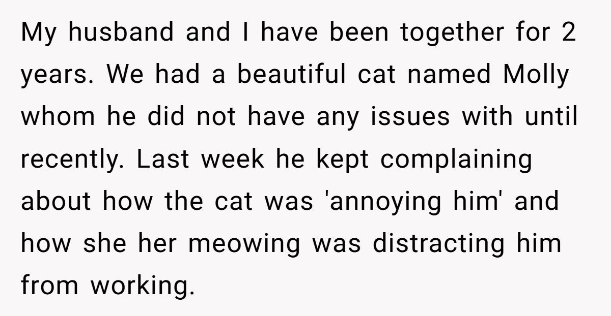 After years together and a shared pet, OP (original poster) thought she and her husband were on the same page. He never expressed issues with Molly until suddenly, out of nowhere, he snapped—claiming he’d always hated cats and couldn’t stand the noise. When OP compromised and agreed to let her cousins care for the cat, he agreed… only to take matters into his own hands. He sold Molly, disappeared her without warning, and now claims he’s the victim for being kicked out.